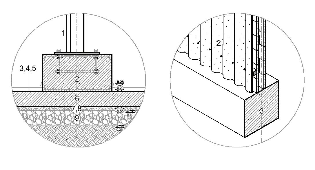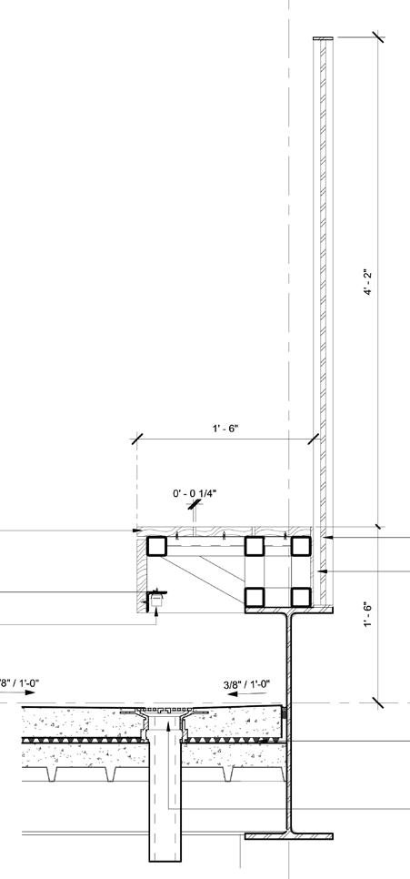 3. Decorative concrete topping slab, on drainage mat, on vapor barrier, on pour-in-place concrete, on metal deck.