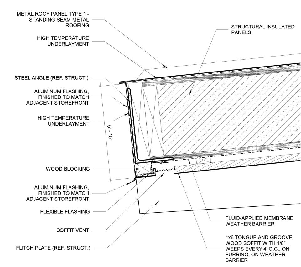 5. Aluminum composite panel, on high temp underlay, on 5/8” cover board, on tapered insulation, on metal framing fully in-filled with batt insulation.