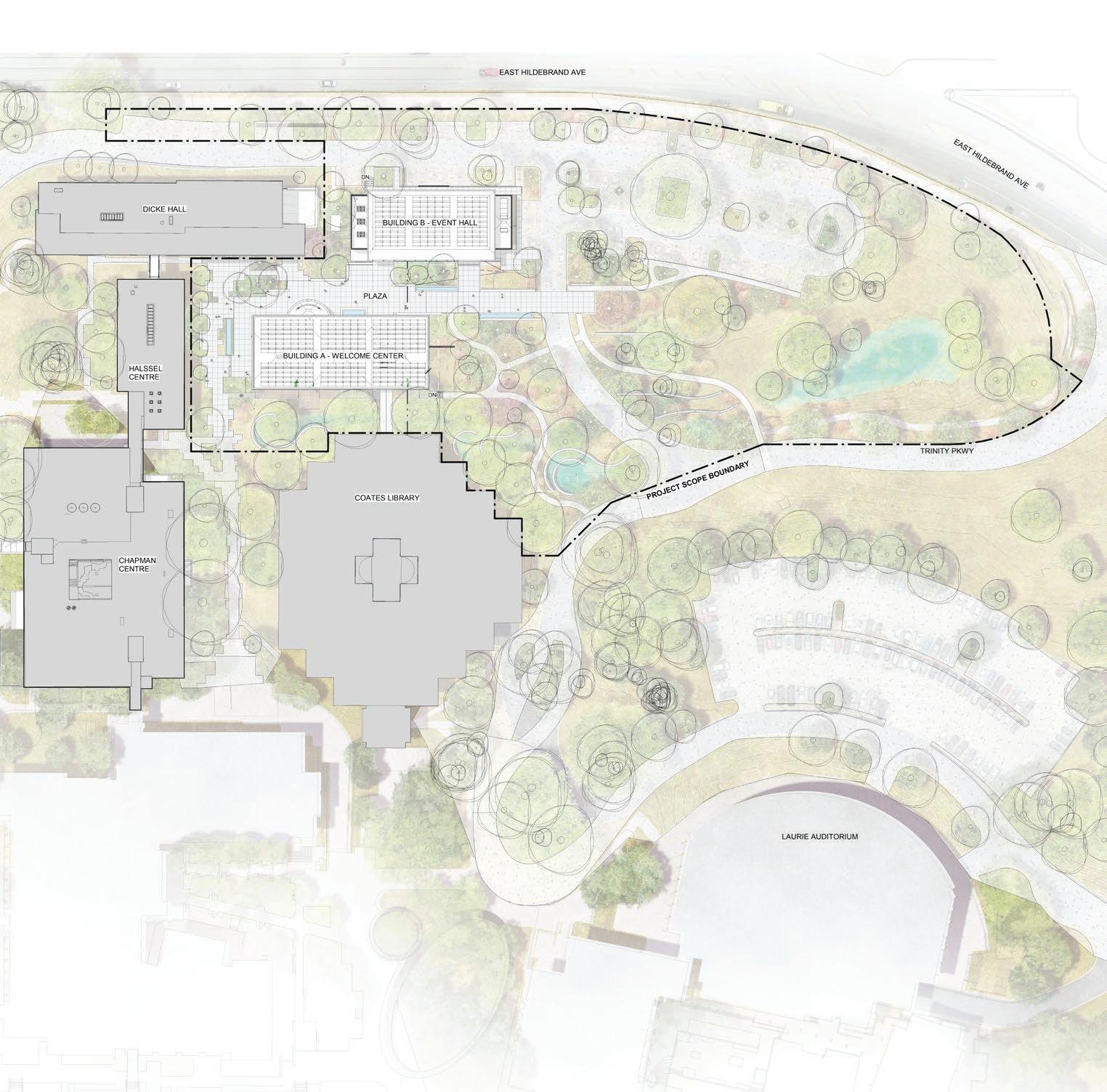 The Trinity University Welcome Center will serve as a “front door” to the campus, complementing the modernist architecture of O’Neill Ford. The project includes two buildings —Welcome Center and Event Hall—linked by a new plaza.