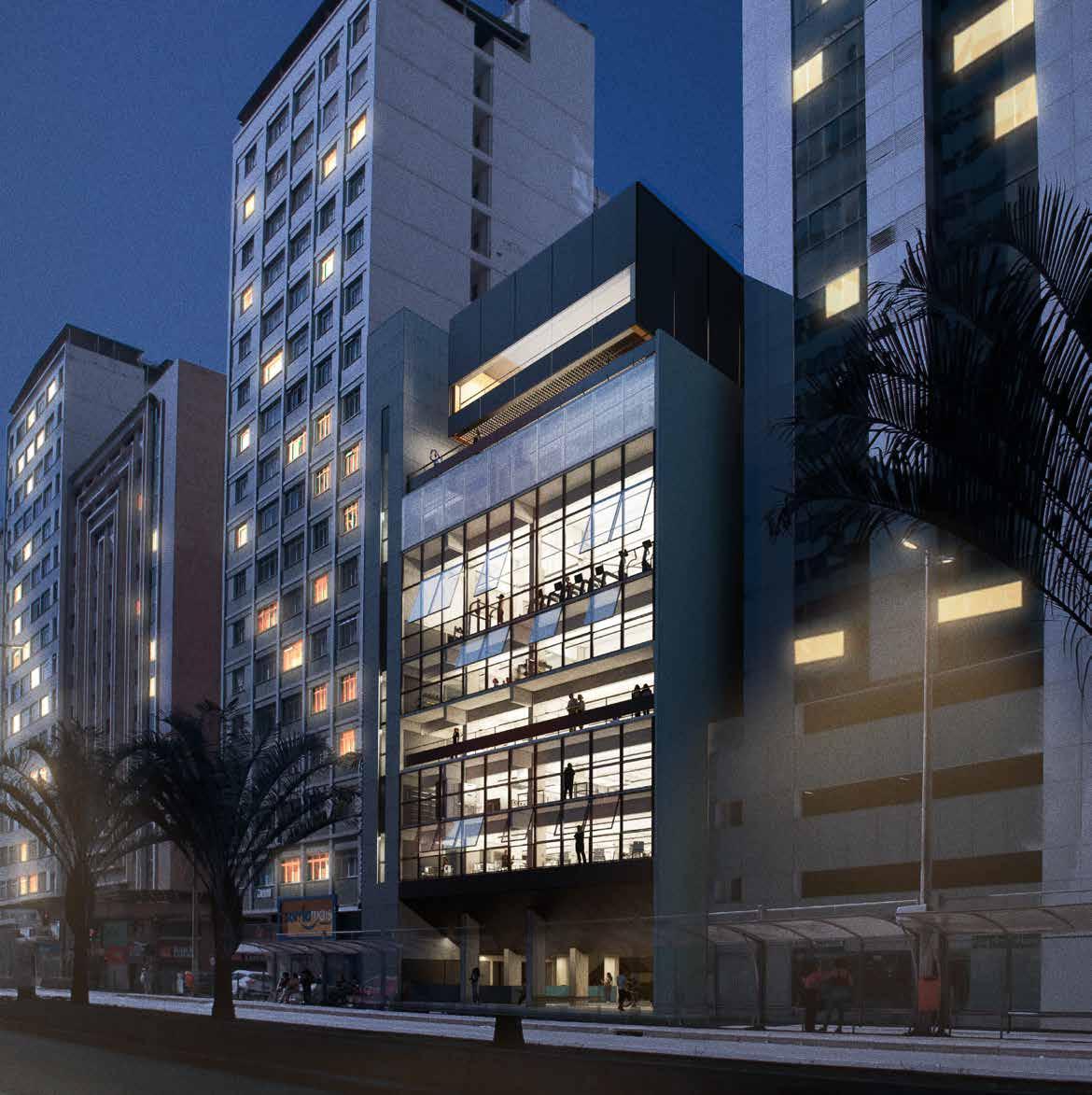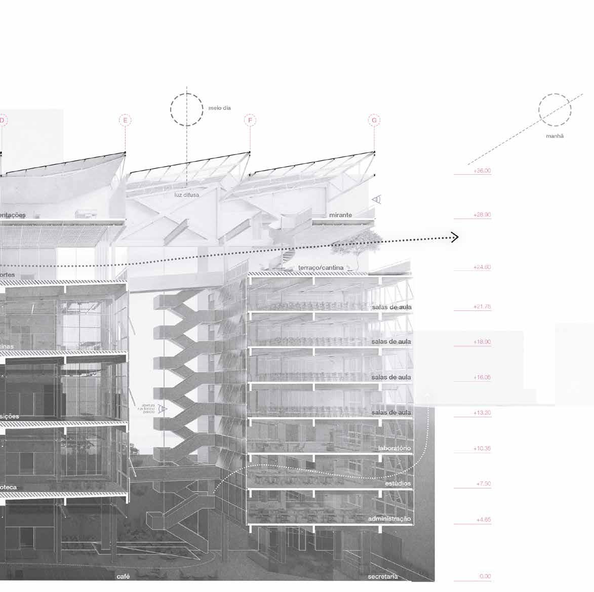 rua e com a paisagem urbana da avenida. Com trinca programática como norte, a intervenção é marcada por remoções, objetivando a habitabilidade e adaptabilidade do espaço, preservando o máximo possível dentro da utilidade. Com a nova situação, tem-se três blocos, nos quais o programa foi organizado por pavimentos e agrupado em blocos análogos: cotidiano, esportes, cultura, educacional.