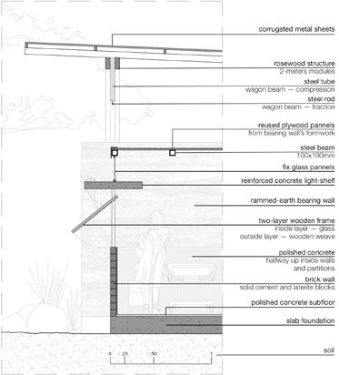 O projeto articula as necessidades da maternidade em sintonia com o clima exigente e o contexto de grande escassez de recursos, buscando uma solução ambiental e socialmente responsável, simples de construir e aberta ao usuário. Poucos movimentos determinam toda a proposta: 8 paredes de taipa são dispostas seguindo uma modulação de 3 metros; entre elas são criados espaços internos e externos; um grande telhado repousa sobre as paredes, oferecendo sombra permitindo fluxo contínuo de ar pelos blocos.