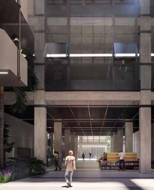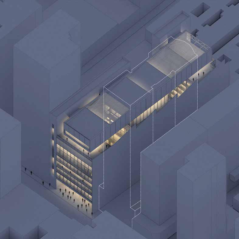 Sobre os pilares que tiveram áreas de influência reduzidas pela demolição dos vãos, apoia-se um grande volume pré-fabricado de estrutura mista — ma-