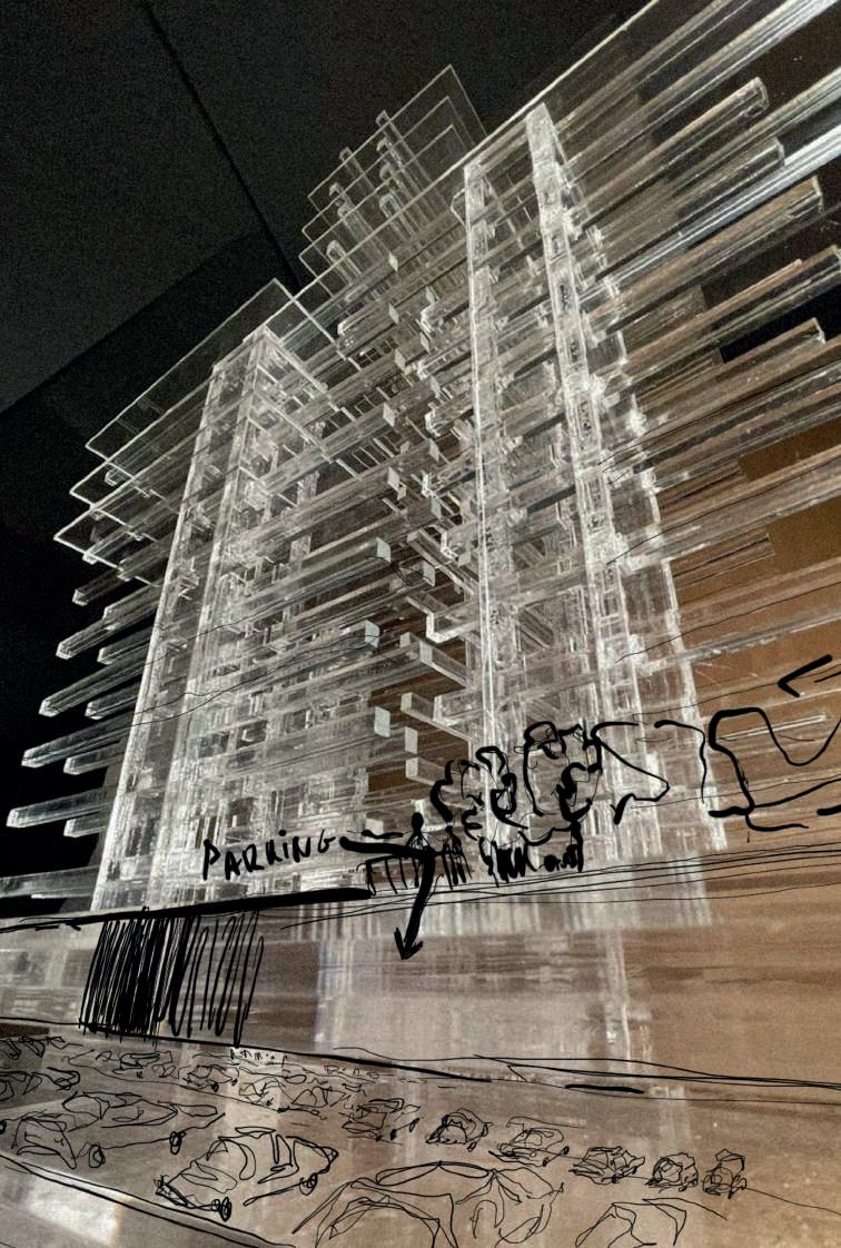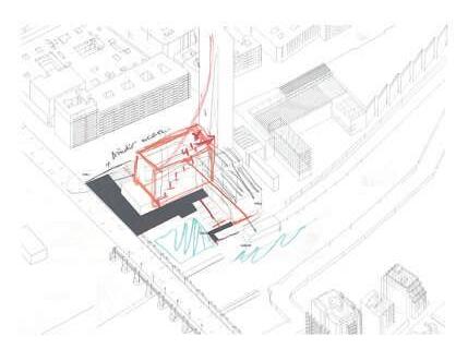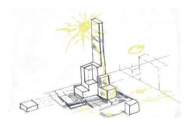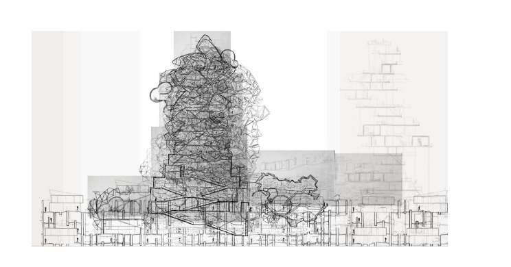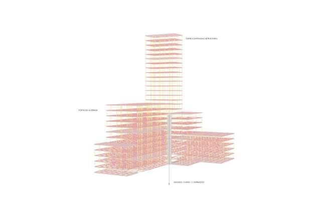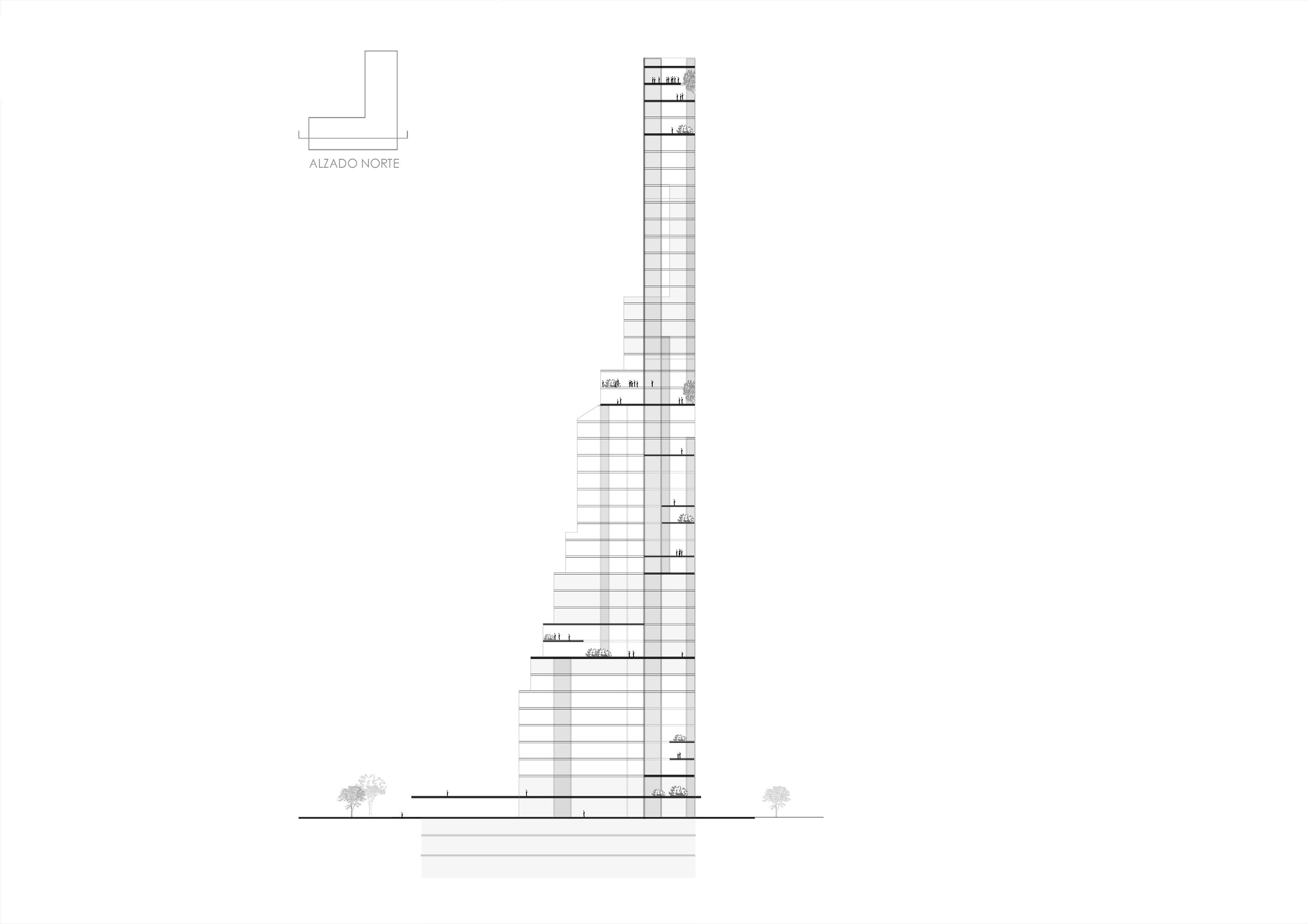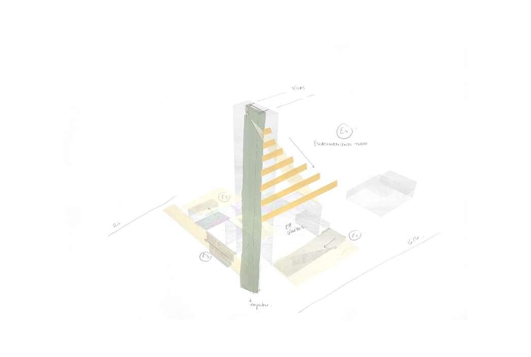 Planteamos mantener el espaccio público en lo alto de la torre, y en la zona urbana, y a su vez que no se pierdan estos espacios de aire urbano en el interior de la torre. La porosidad espacial, remarcando los vacíos interiores con espacio público.