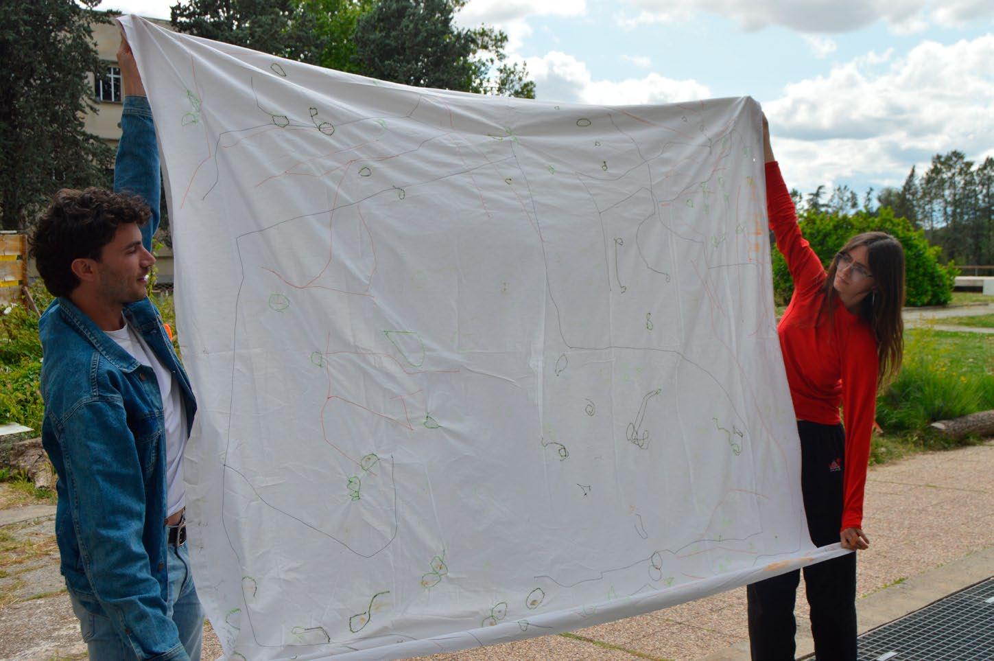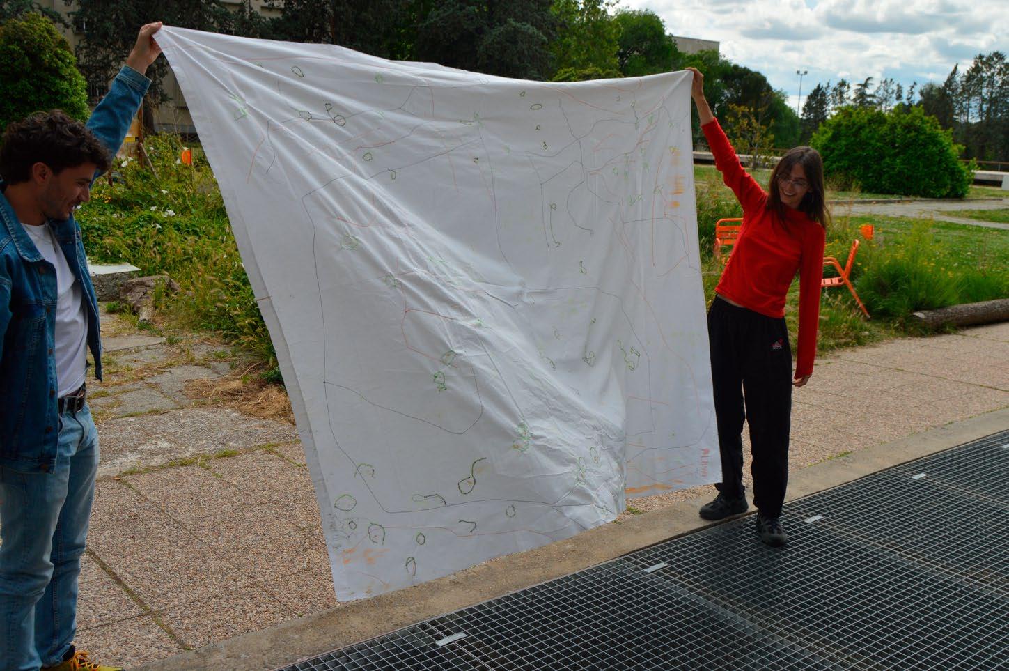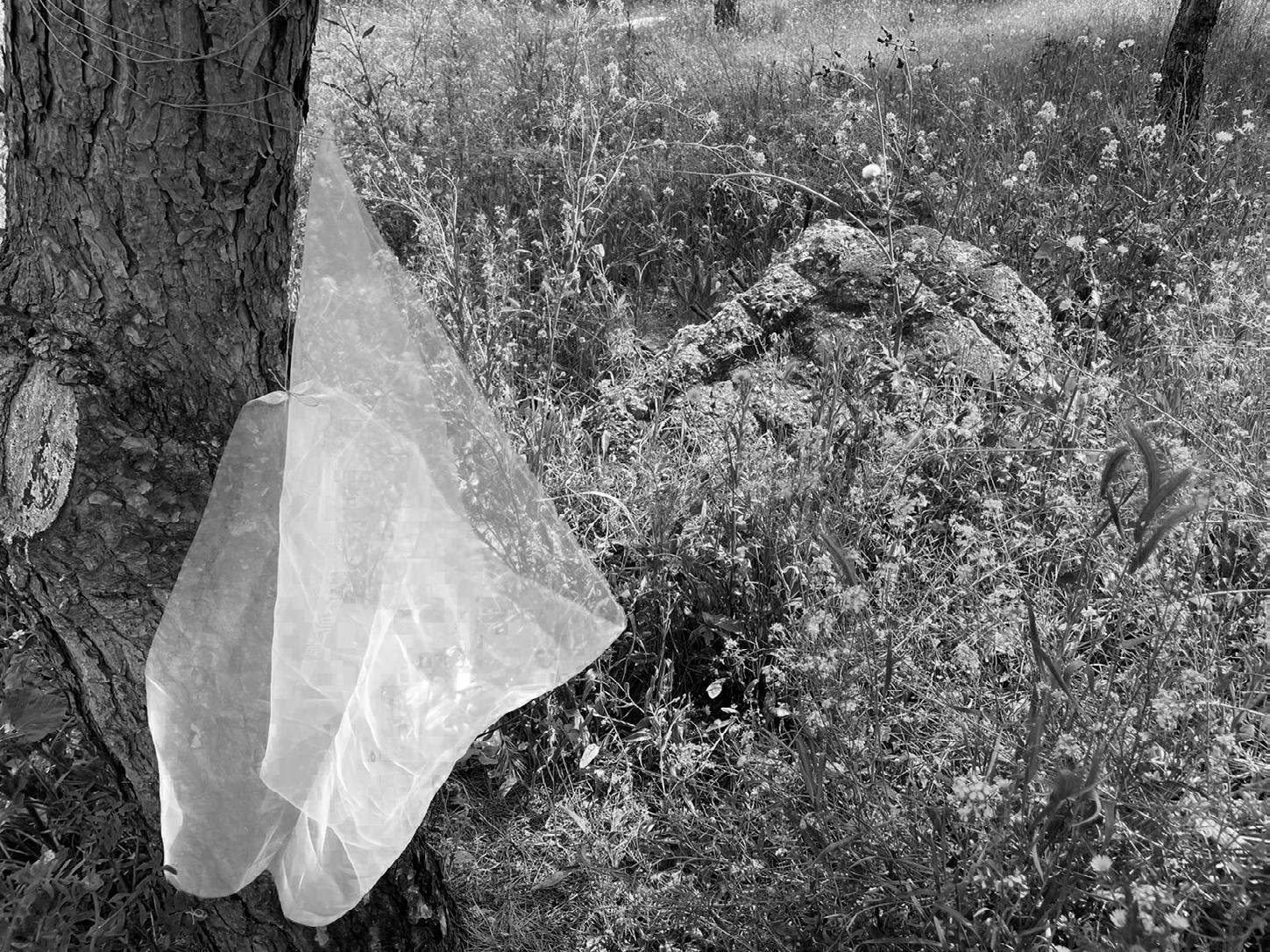 Todavía se está en proceso de cartografiar minuciosamente cada uno de estos movimientos, pero se ha querido revertir la situación que se vivió. Creando una cápsula cilíndrica que proporciona una panorámica de un doble frottage De la corteza exterior de un árbol (40°28’50.1”N 3°39’06.1”W) que no sirvió como cobijo, y caso de estudio. Este positivo quiere encapsular la experiencia que supone la estancia junto a un árbol. Al revertirlo, la parte interior del árbol, por donde circula la sabia bruta, se ha representado con un plástico doble de unas dimensiones un poco mayores a la tela, representando así la inquietud por crecer y el flujo constante de sabia por interior de estos seres vivos .