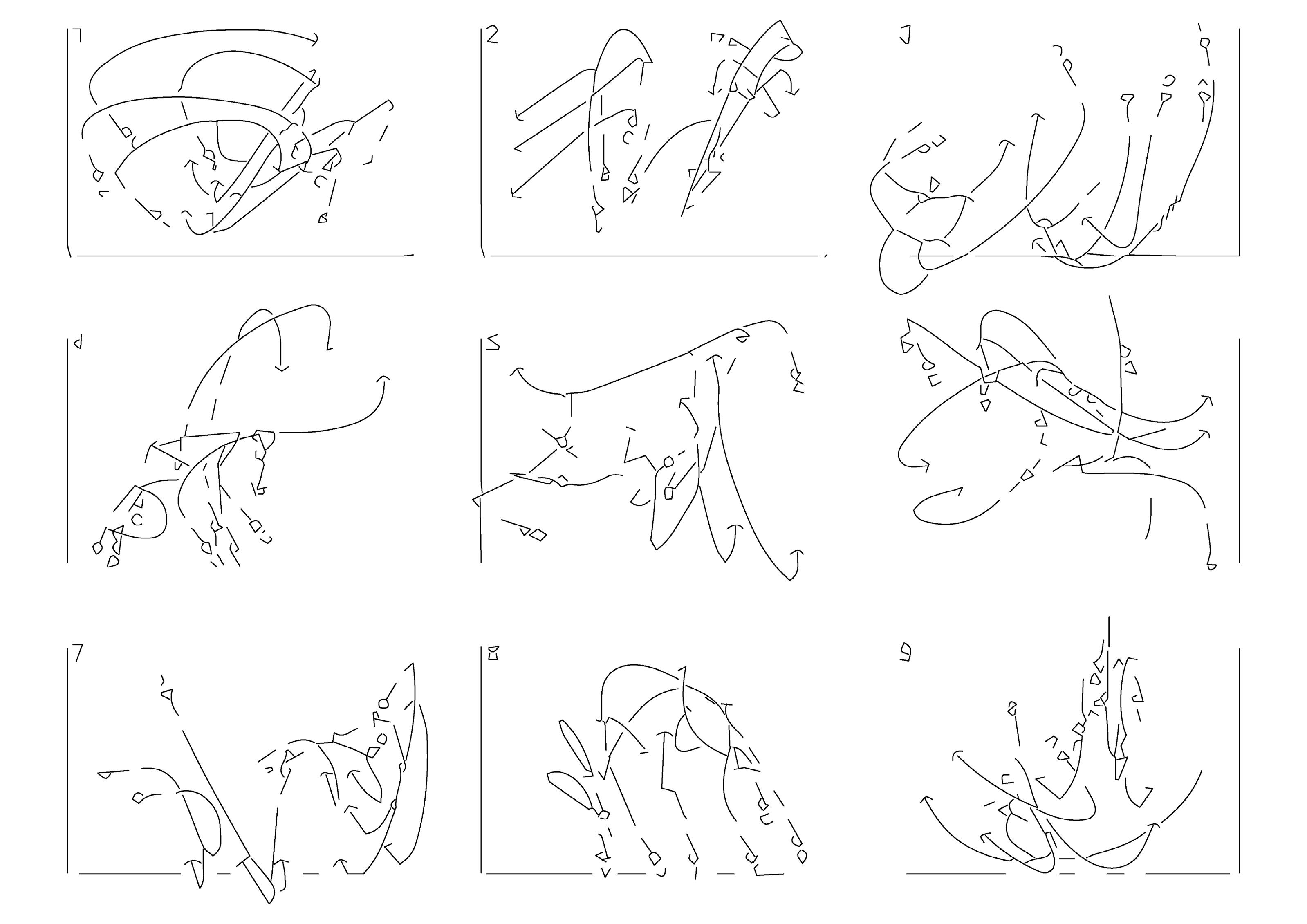 De la lectura y trabajo sobre el libro “Cómo dibujar un árbol”, la manera gráfica se pasa comprender el blanco del papel como las copas de los árboles vistas desde abajo. Y es así como se realiza y traduce la sensación interior del momento de la batucada de la primera visita a una cartografía en el plano Y-Z. en la que se trata de buscar un lenguaje que hable gráficamente.