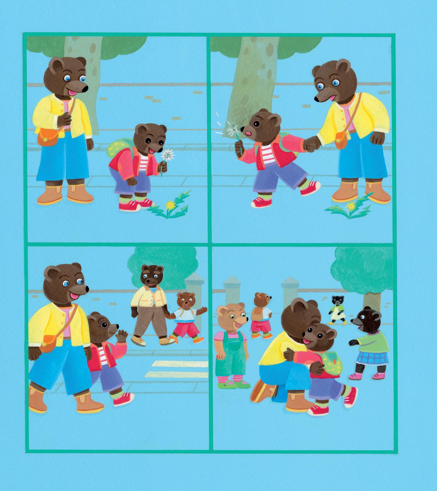 5. La mama diu: —Corre, Brunet, que és tard! Però l’osset, fffff!, vol tornar a bufar.