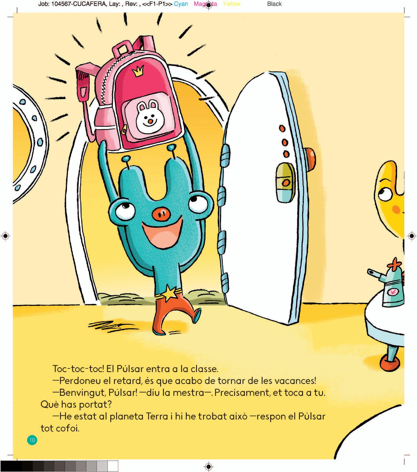 El primer dia de curs extraterrestre, els alumnes porten un record de les vacances: un instrument de música per ballar, un perfum que fa pudor, una conquilla per escoltar el silenci, una samarreta... i una motxilla del planeta Terra, que una nena terrícola busca desesperada. Els extraterrestres la hi tornaran?