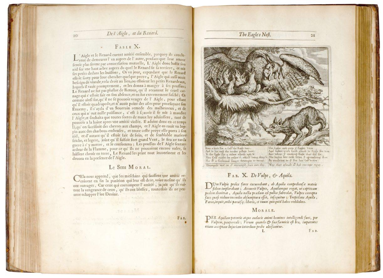 BARLOW, Francis. (Aesop). Behn, Aphra Aesop’s Fables with his Life: in English, French and Latin. Newly translated. Illustrated with one hundred and twelve sculptures. To this edition are likewise added, thirty one new figures representing his life by Francis Barlow London. H. Hills jun. for Francis Barlow. 1687