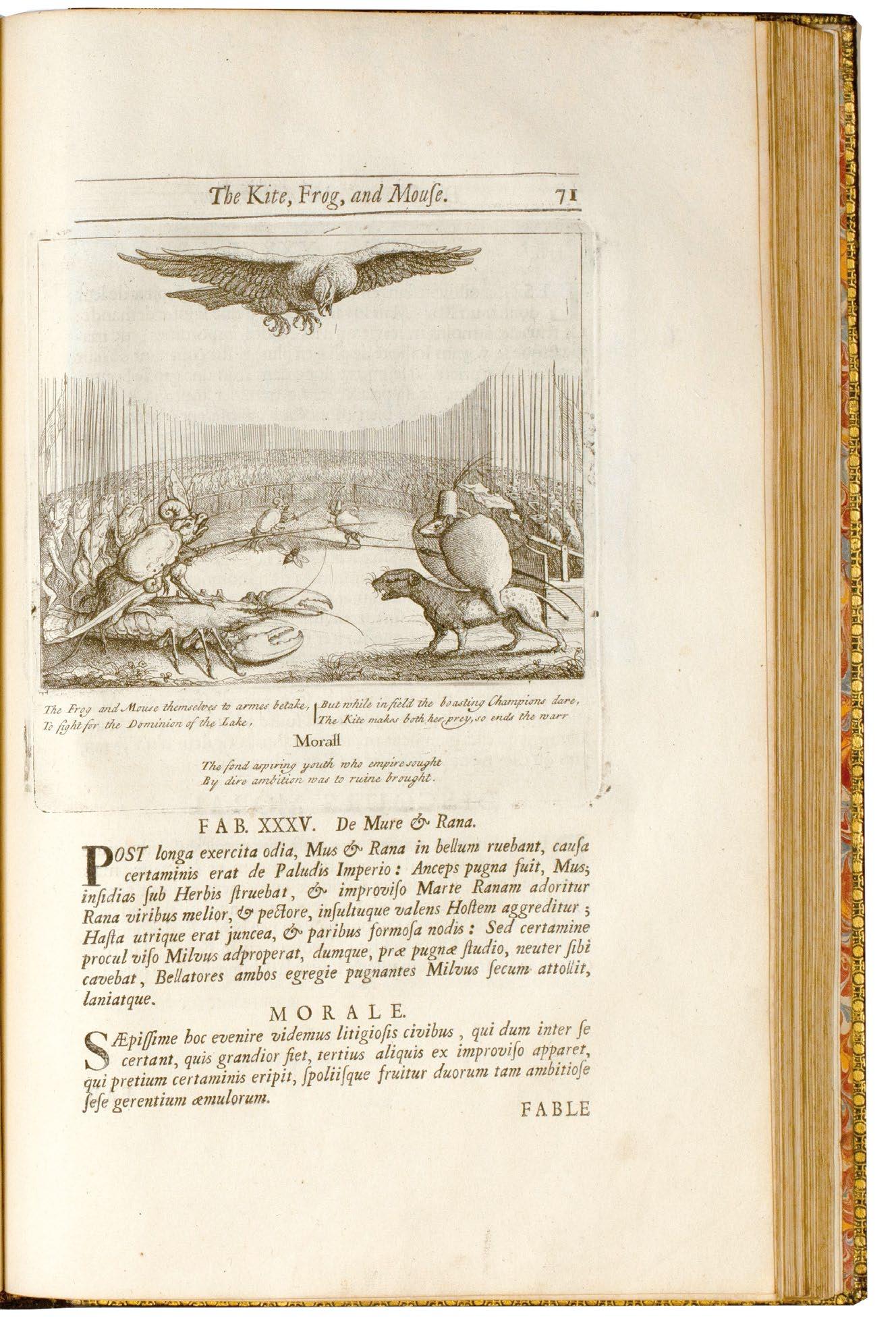 Folio. (356 × 242 mm). [161 leaves including additional engraved title; pp. (i), (i), (iii), (i), 40, 31, 17, 2–221, (ii)]. Printed title within double rules, engraved title by Barlow with central title within elaborate cartouche and surrounded by an eagle, leopard, boar, fox, wolf and lion, leaf with large decorative woodcut inhabited ten-line initial and Barlow's dedication to Sir Francis Pruijan (or Prujean), leaf with Barlow's 'To the Reader', leaf with engraved frontispiece of Aesop with animals and additional engraving with text beneath, 20 leaves with 'A Brief Prospect of the Life of Aesop', 16 leaves with 'La Vie d'Esope', 9 leaves with 'Aesopi Philosophice Fabulantis, Vita' and Aesop's 110 fables illustrated with 110 engravings, final leaves with 'La Table' and 'The Table', decorative woodcut initials and tail-pieces throughout; sheet size: 350 × 228 mm. Full contemporary calf, boards ruled in blind, later spine with red morocco label with gilt title and blind rules in seven compartments, marbled edges.
