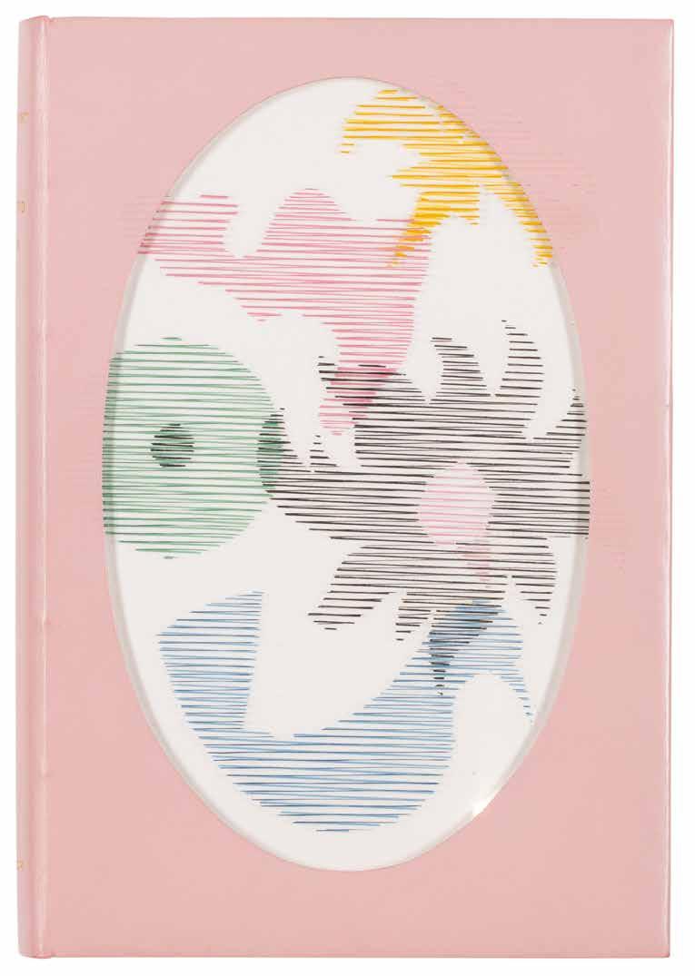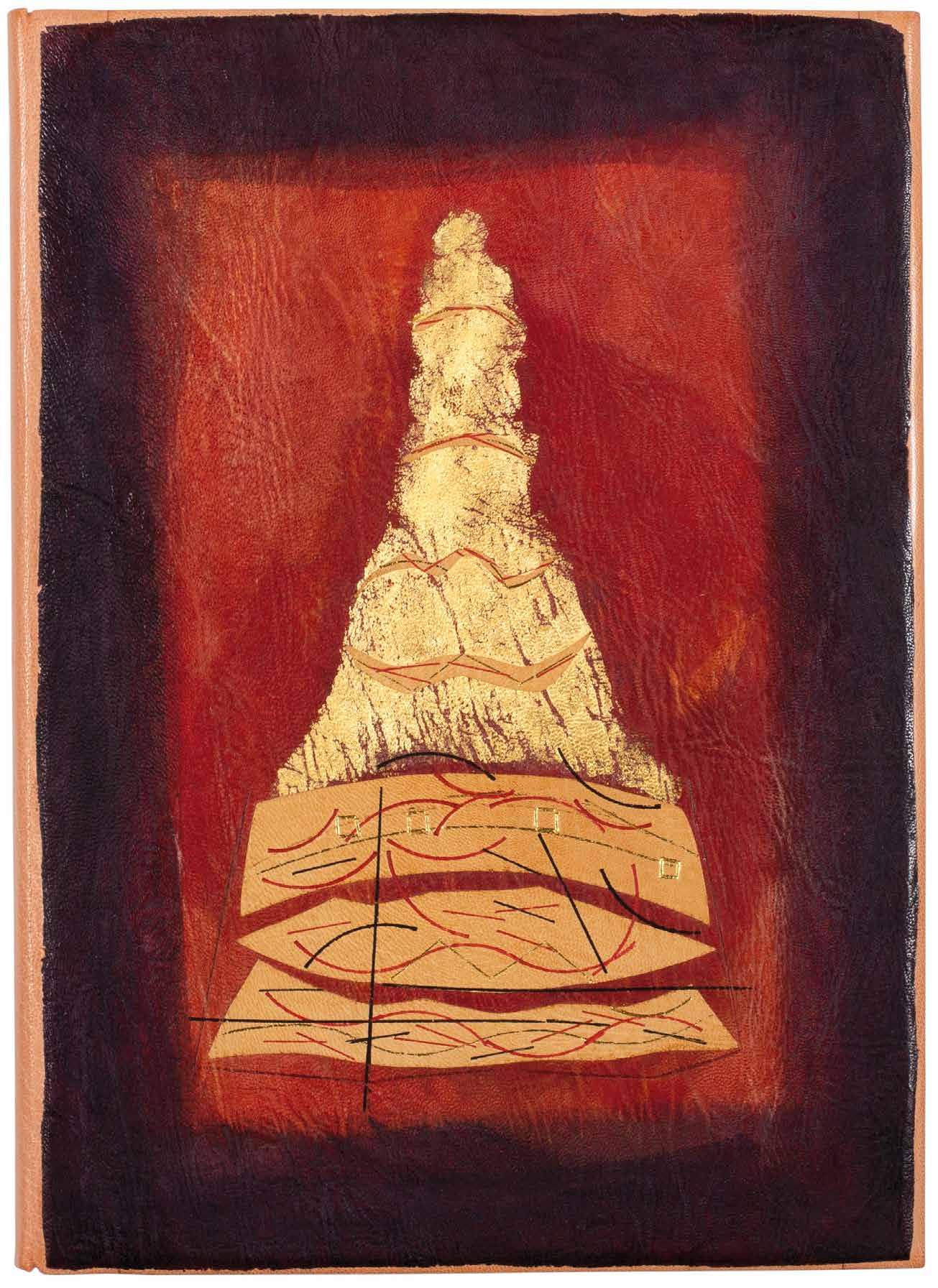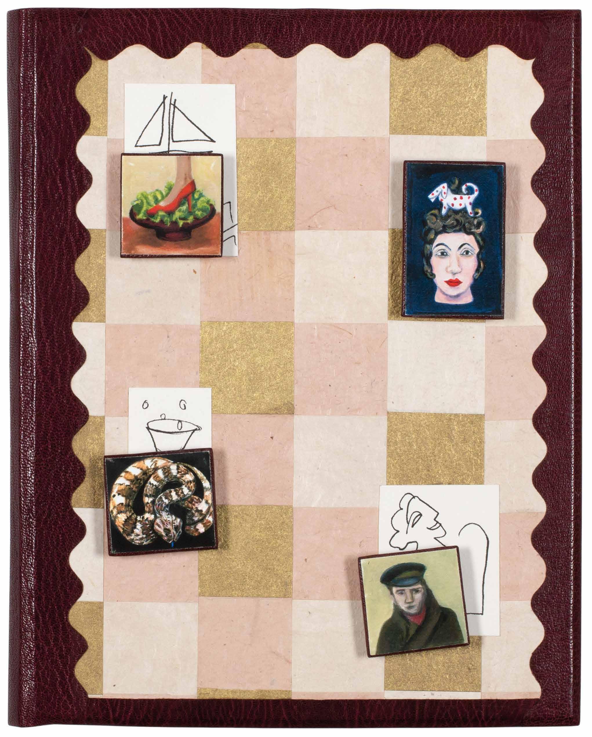 Folio. (290 × 230 mm). [50 unnumbered leaves including blanks]. Full burgundy crushed morocco, excised sections with curvilinear edges reveal a checkerboard pattern of gilt, pink and café crème paper, front board with three applied sections of white paper with monochrome drawings and four colour paintings mounted to squares or rectangles of burgundy crushed morocco with magnetic fastenings, single painting mounted to rectangle of burgundy morocco affixed to centre of rear board, smooth spine with tooled title in black, cream handmade patterned paper doublures, bronze free endpapers, burgundy velvet-lined oatmeal drop-back box with morocco label to spine with title in black.