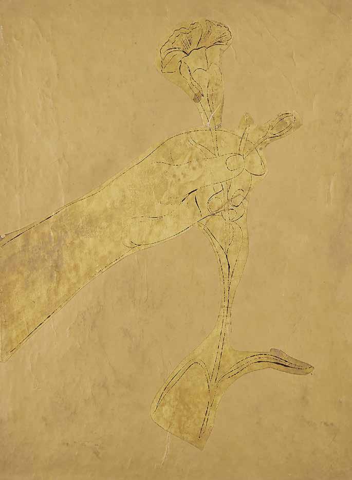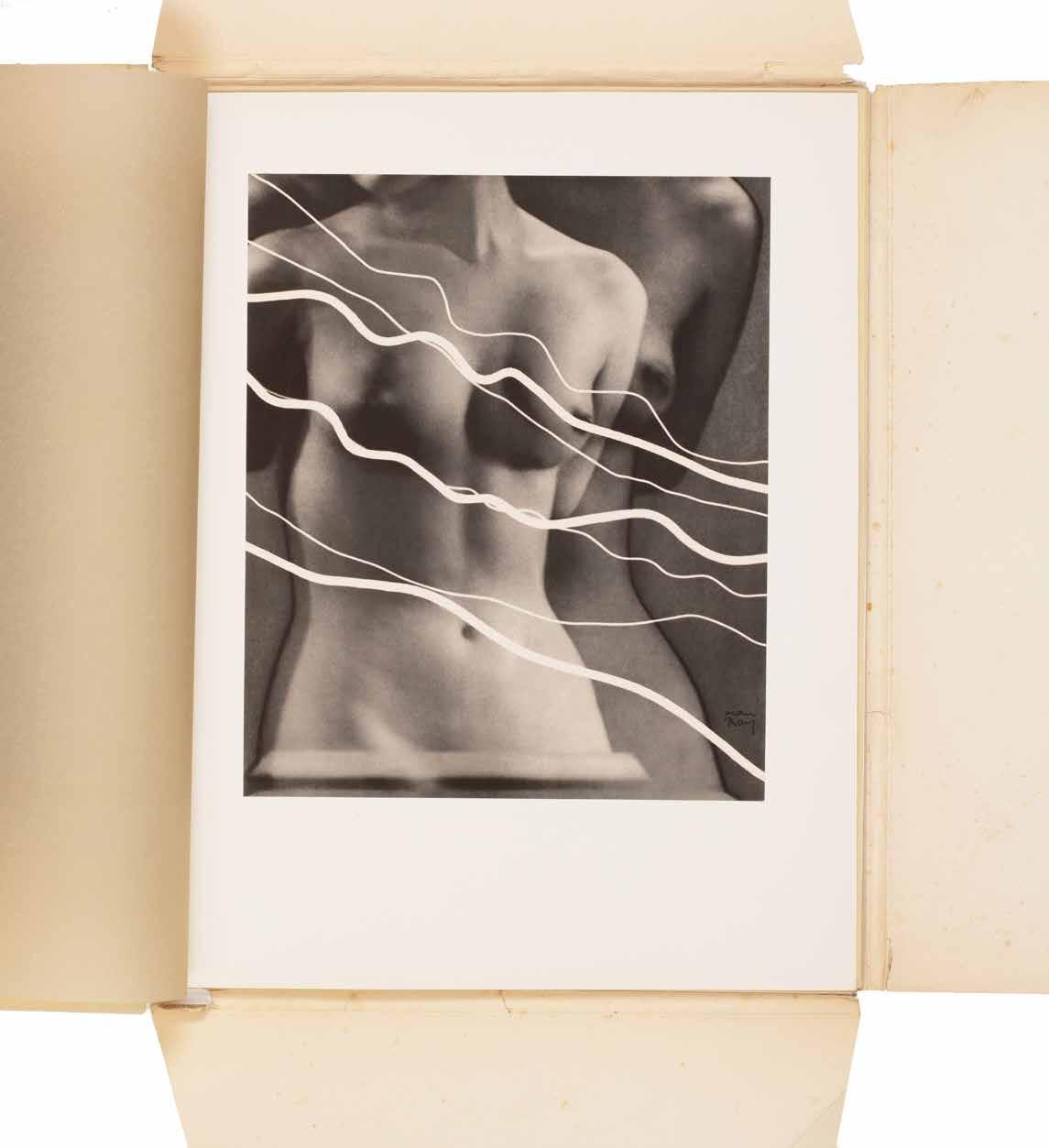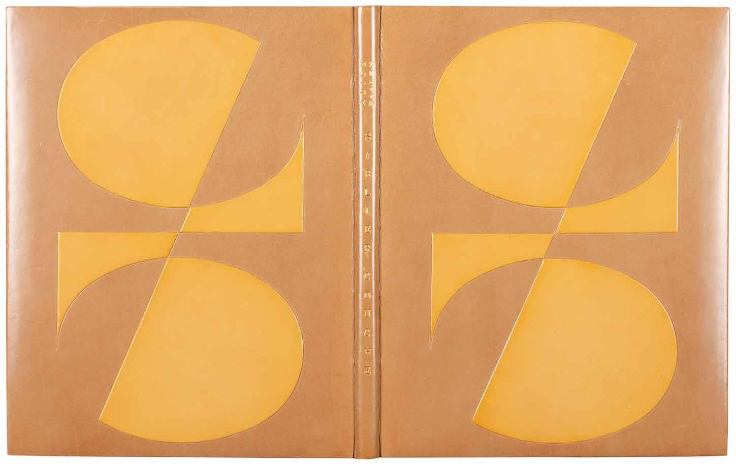 Folio. (290 × 230 mm). [50 unnumbered leaves including blanks]. Full burgundy crushed morocco, excised sections with curvilinear edges reveal a checkerboard pattern of gilt, pink and café crème paper, front board with three applied sections of white paper with monochrome drawings and four colour paintings mounted to squares or rectangles of burgundy crushed morocco with magnetic fastenings, single painting mounted to rectangle of burgundy morocco affixed to centre of rear board, smooth spine with tooled title in black, cream handmade patterned paper doublures, bronze free endpapers, burgundy velvet-lined oatmeal drop-back box with morocco label to spine with title in black.