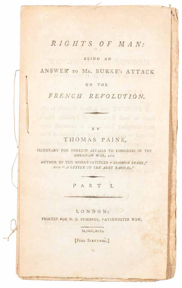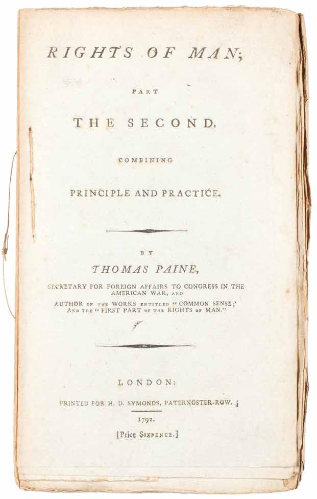 on the populace he himself (see PMM) thought Paine correct – the analysis of basic democratic rights was so crucial that it proved very popular and was reprinted numerous times. The two parts presented here, each with an individual price, unbound and stab stitched as issued, demonstrate that the ‘Rights of Man’ was made available as a pamphlet for ease of distribution and concurrent popular influence.