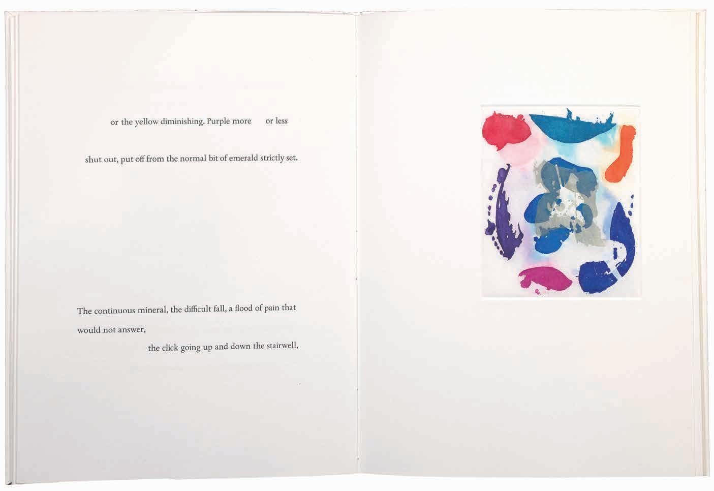Folio. (398 × 288 mm). [18 unnumbered leaves]. Kathleen Fraser’s verse iIllustrated with six original colour aquatints by Sam Francis and justification. Original publisher’s wrappers with title in blind to front cover, original publisher’s blue cloth box.
