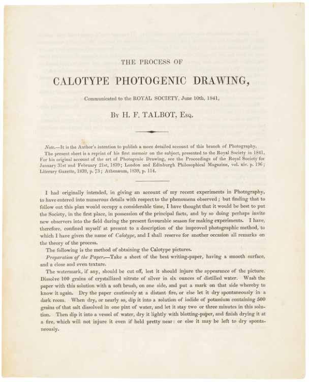 Although Talbot had announced his researches and progress in the field of what was to become photography in his 1839 lecture to the Royal Society (‘Some Account of the Art of Photogenic Drawing ... &c.’), that lecture, although ground-breaking, dealt largely with the achievement of an image on treated paper and only alluded briefly to the possibility of a more versatile development. It was not until his 1841 lecture to the same body (the title as per the present publication is ‘The Process of Calotype Photogenic Drawing ... &c.’) that the details of his refinements, and most particularly his successes with the negative / positive process, were delineated. Those successes and Talbot’s development of the resultant negative / positive process for photographic reproduction and duplication remained the predominant methodology in the field for more than 150 years; all subsequent refinements, whether in the chemicals used, differing methods for image capture, printing and so on, were merely variations on Talbot’s