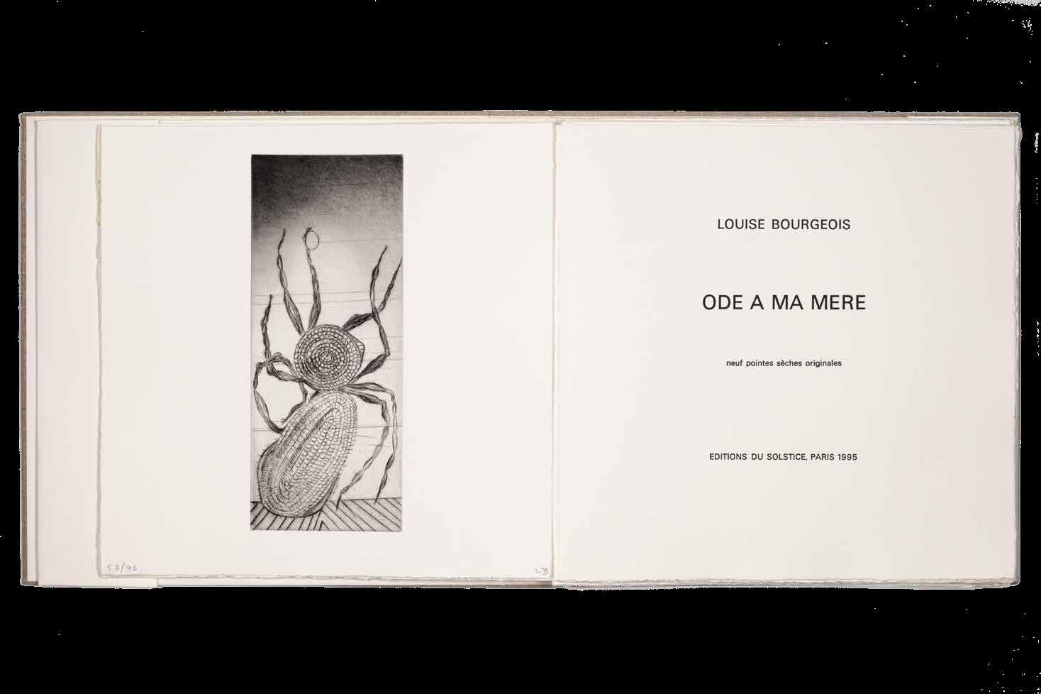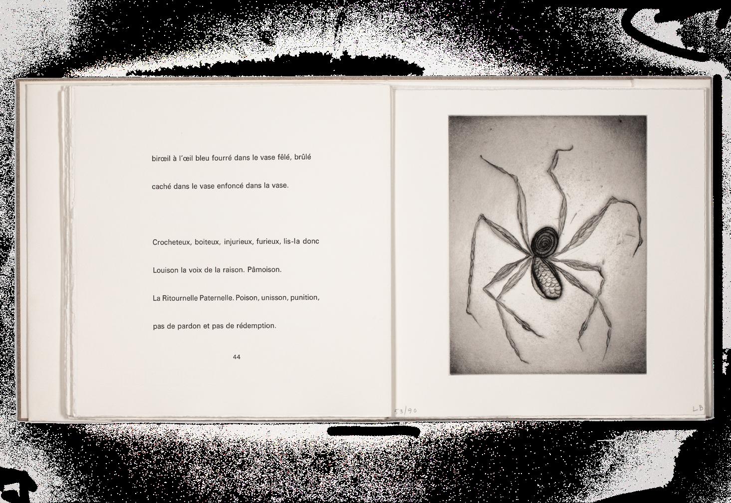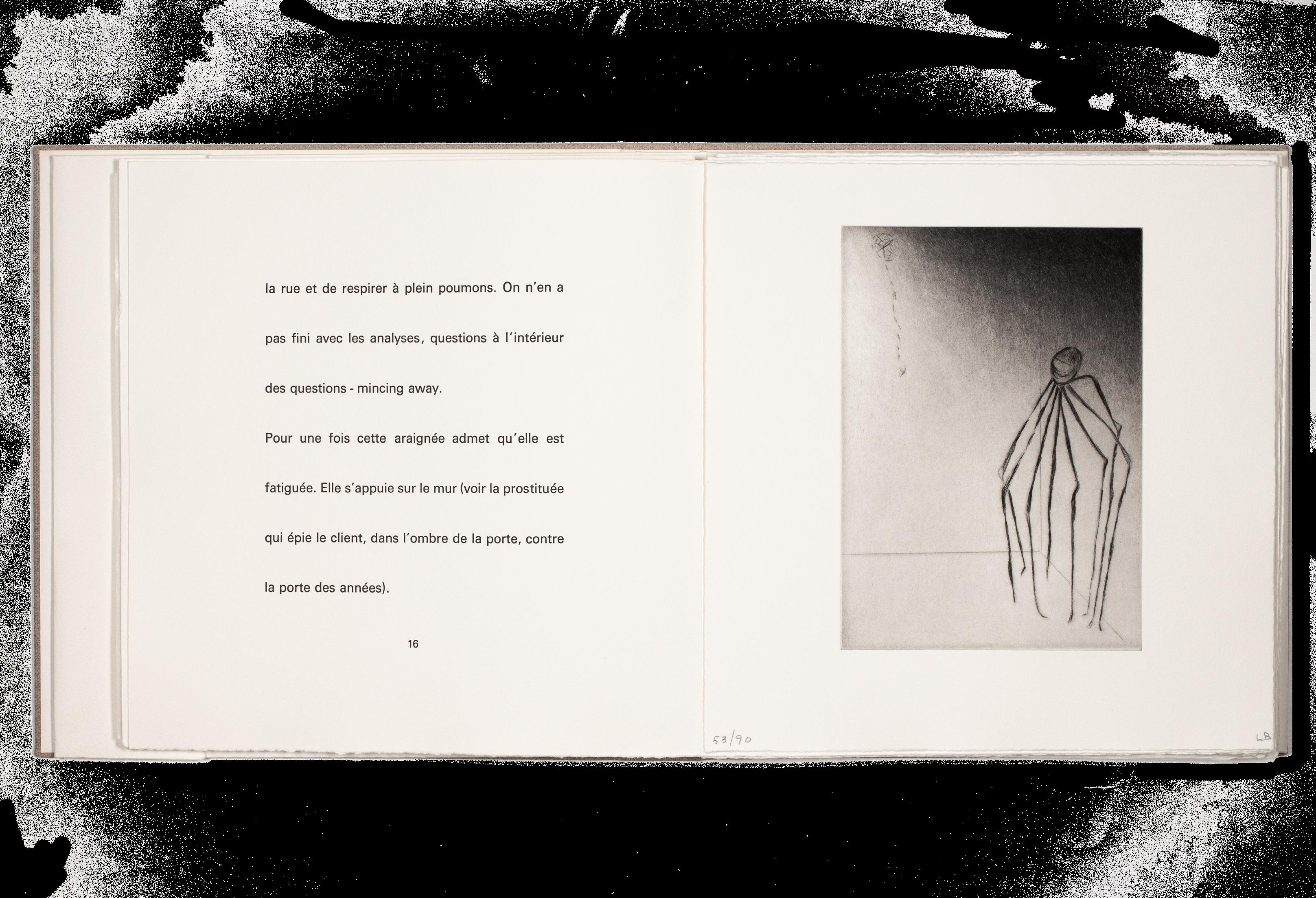 All of Bourgeois’ engravings feature the motif of the spider: apparently different species of spiders engaged in different arachnid acts of spinning, climbing, making webs, hunting, or even in the final etching, seeming to give birth, albeit a human-headed spider to a human-headed baby. The accompanying verse – Bourgeois writes in a streamof-consciousness patois of English and French – delineate and underline the themes of her oeuvre that have now