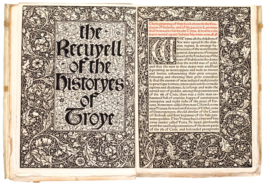 ¶ The Kelmscott Press edition of Caxton’s ‘The Recuyell of the Historyes of Troye’, the first book printed in English.