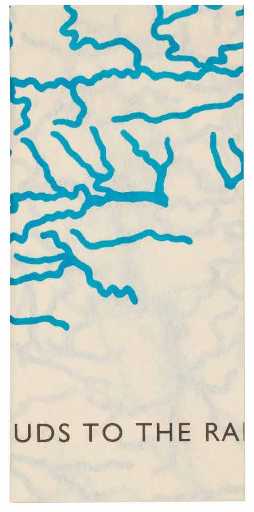 Printed entirely in blue, the rivers and loughs give an alternate sense of Ireland, usually imagined as the emerald isle, as an island of blue. Beneath Long’s image is the printed legend iterating the endless cycle of water: ‘FROM THE SEA TO THE CLOUDS TO THE RAIN TO THE LAND TO THE RIVERS TO THE SEA ’.