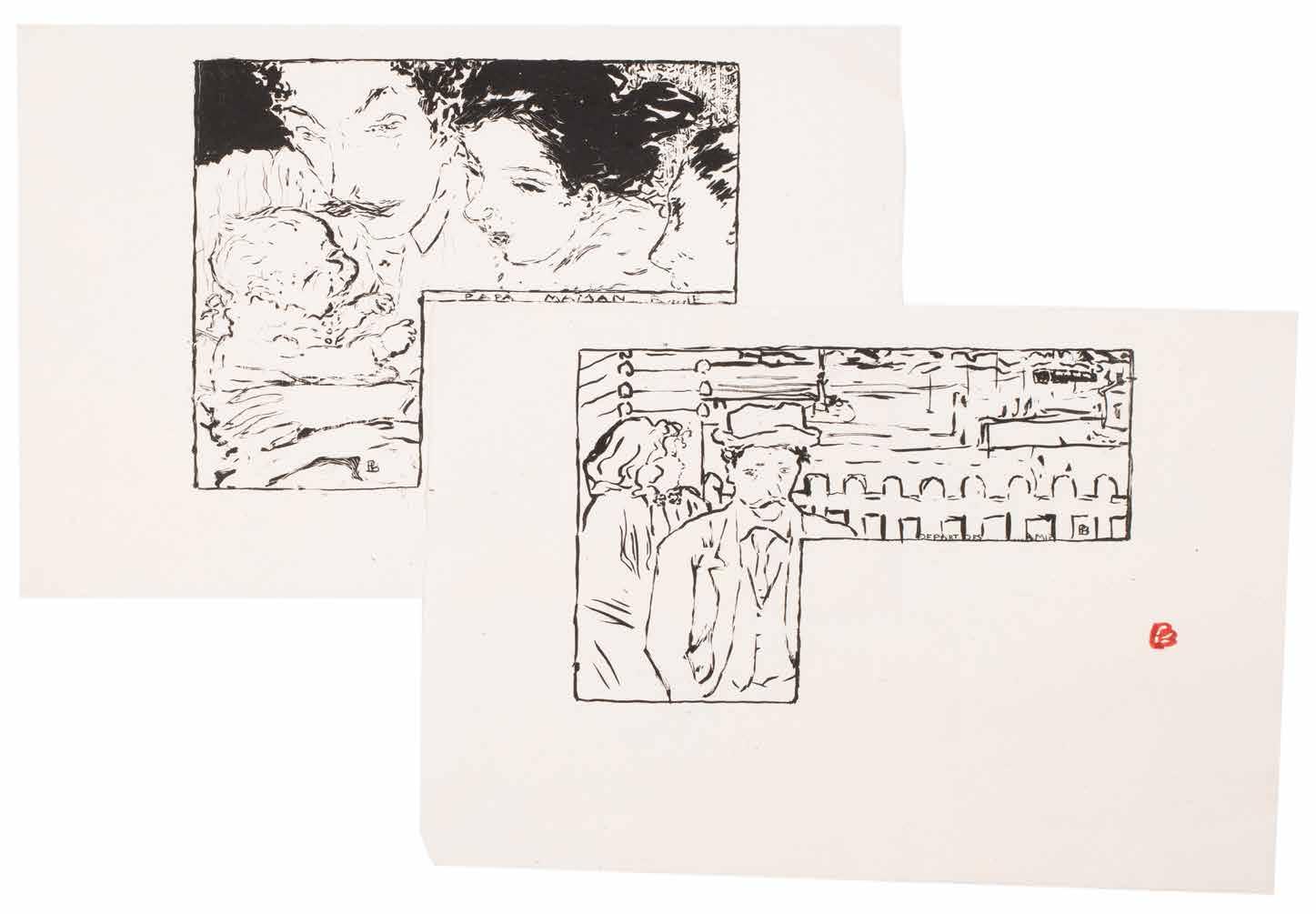 The exceptionally rare suite of the 19 prints printed without text and with each image signed by Bonnard with his initials, in brush, either in scarlet or blue.