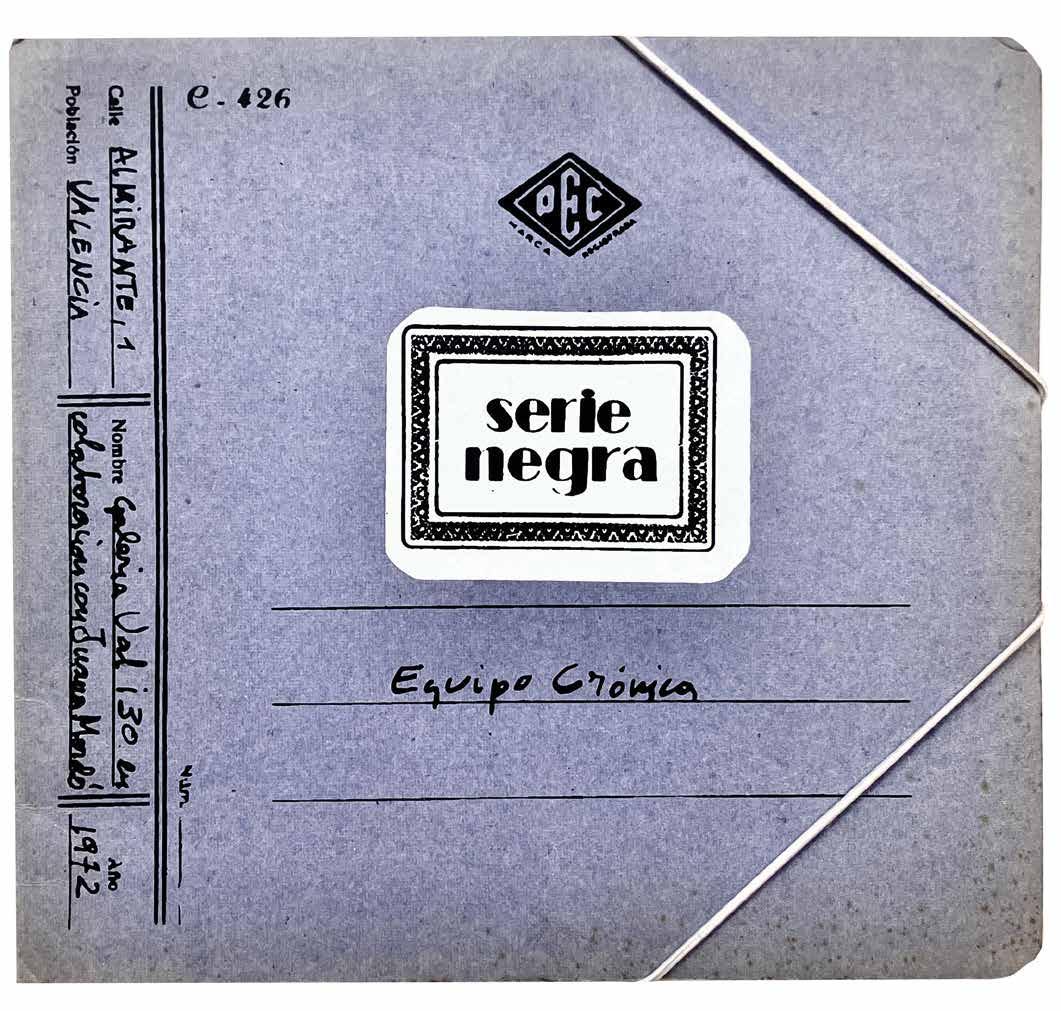 Issued in the form of a film storyboard, ‘Seria Negra’ is a monochromatic screenprint composition of individual frames printed in a lush chocolate and cream. ‘Equipo Crónica’, the collective that produced the book, were a Popinfluenced duo of Manolo Valdés and Rafael Solbes (a third member had departed in 1967) founded in Valencia in 1964. Early exhibitions with Clavé, Saura, Tàpies and others prompted Valdés and Solbes to form first ‘Estampa Popular’,