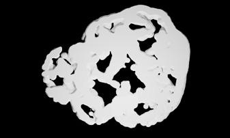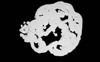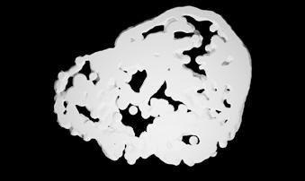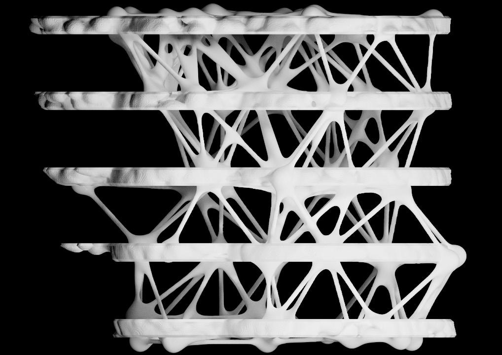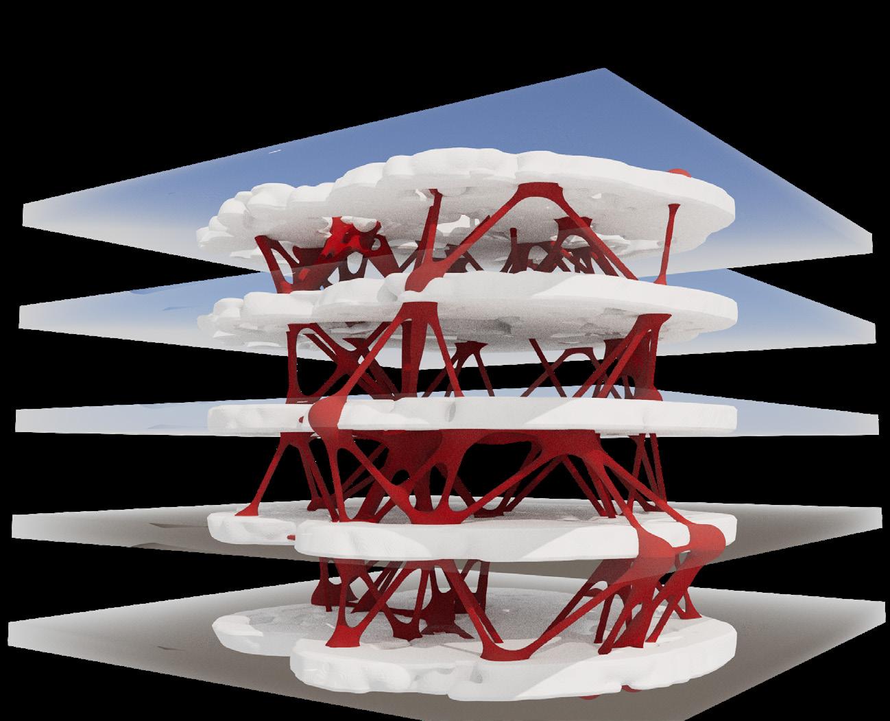 After some processing of the ink form, I was able to solidify the form and have a solid feeling, so I started the preliminary construction of the specific form of the building. Here is my first setup process and the results. By studying the section of this entity, I found that its holes have space and three-dimensional sense. So, I took each of these slices apart and connected them by extracting some of these particles to get the initial shape of the building. I had a certain image of them. Maybe they could be a restaurant or an observation deck.