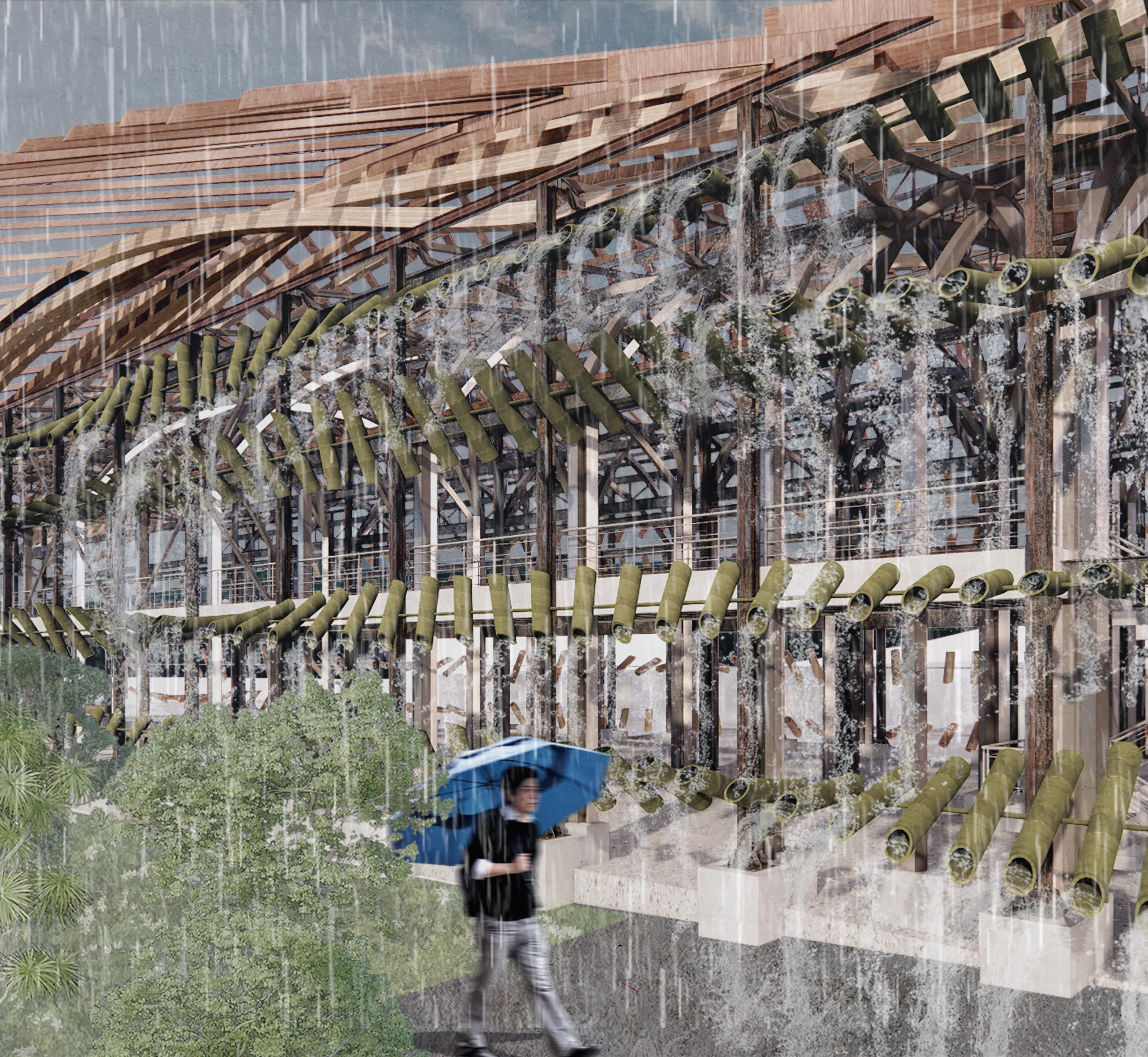 5. Use of traditional lean device. The Intergration, combined with a Japanese water feeding device, is designed as an exterior wall that interacts with rainwater to simulate the effect of ripples.