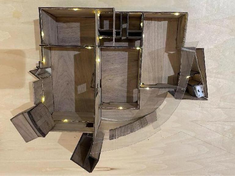 Through the draft model established in the above, I calculated the size of the parts in each position and drew it down. I bought some materials such as walnut board and acrylic and cut them with a laser printer. Small grooves are cut out of the floor to build the basement, and the grooves also serve as supports for the walls.