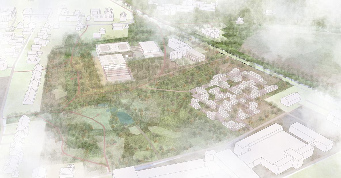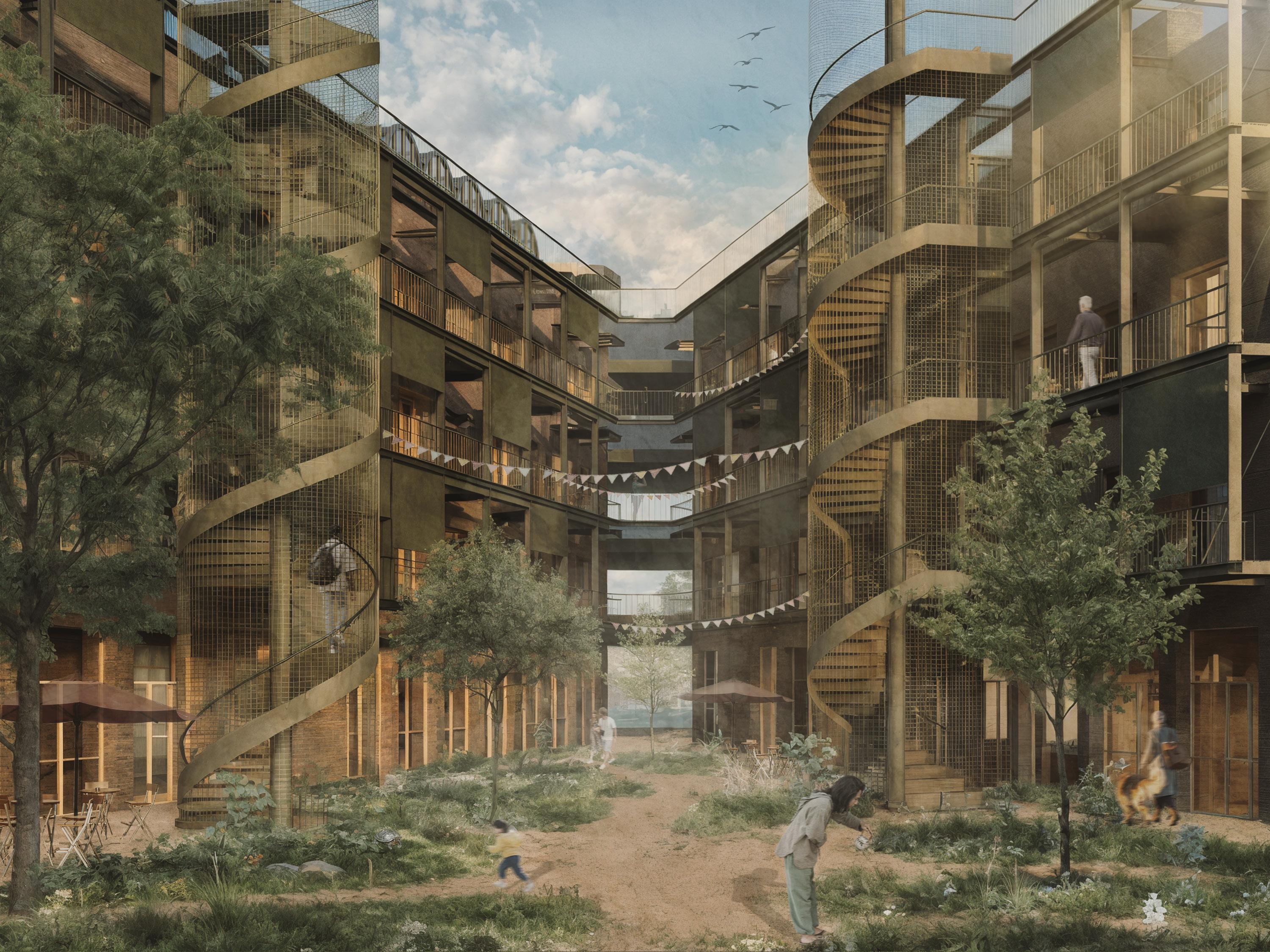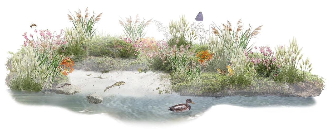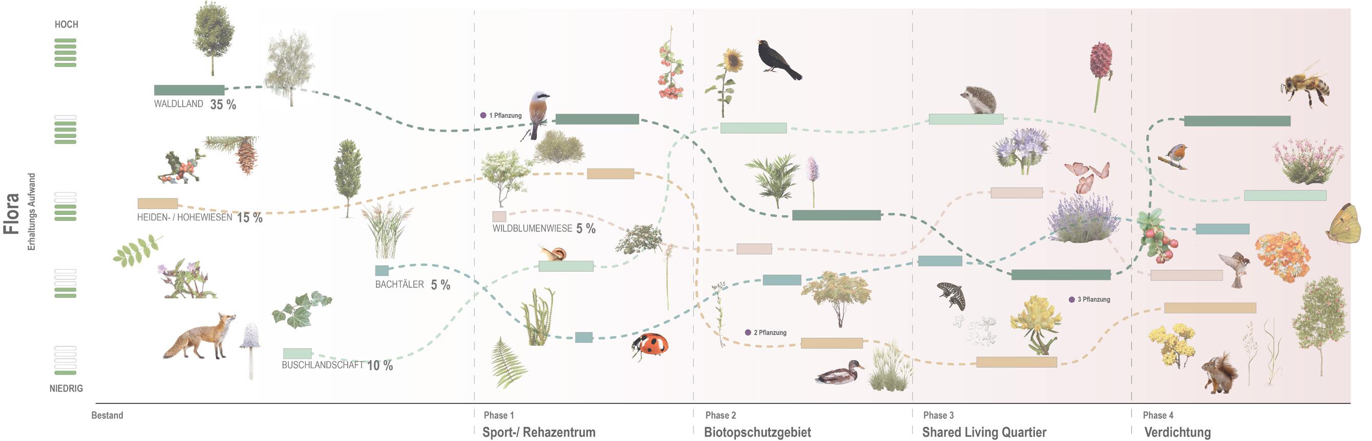Im Fokus des Projektes steht die Idee, ein Quartier zu gestalten, dass Lebensraum von Mensch, Flora und Fauna dient und dessen Koexistenz fördert. Ein signifikanter Teil des kontaminierten Geländes wird in naturnahe Ausgleichsflächen umgewandelt, aufgeforstet und als vielfältige Biotope entwickelt. Es werden gezielt Rückzugsorte und Lebensräume für heimische Tier- und Pflazneartengeschaffen. Unterstützung werden diese Tierarten durch Animal-Aided-Dersigns in der Architektur.