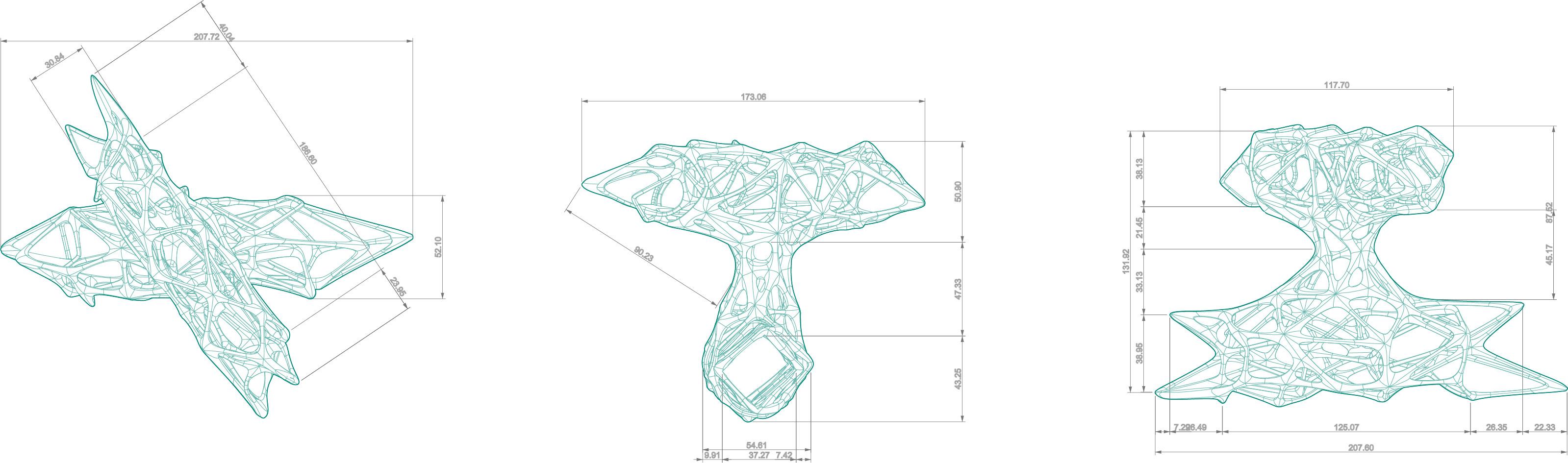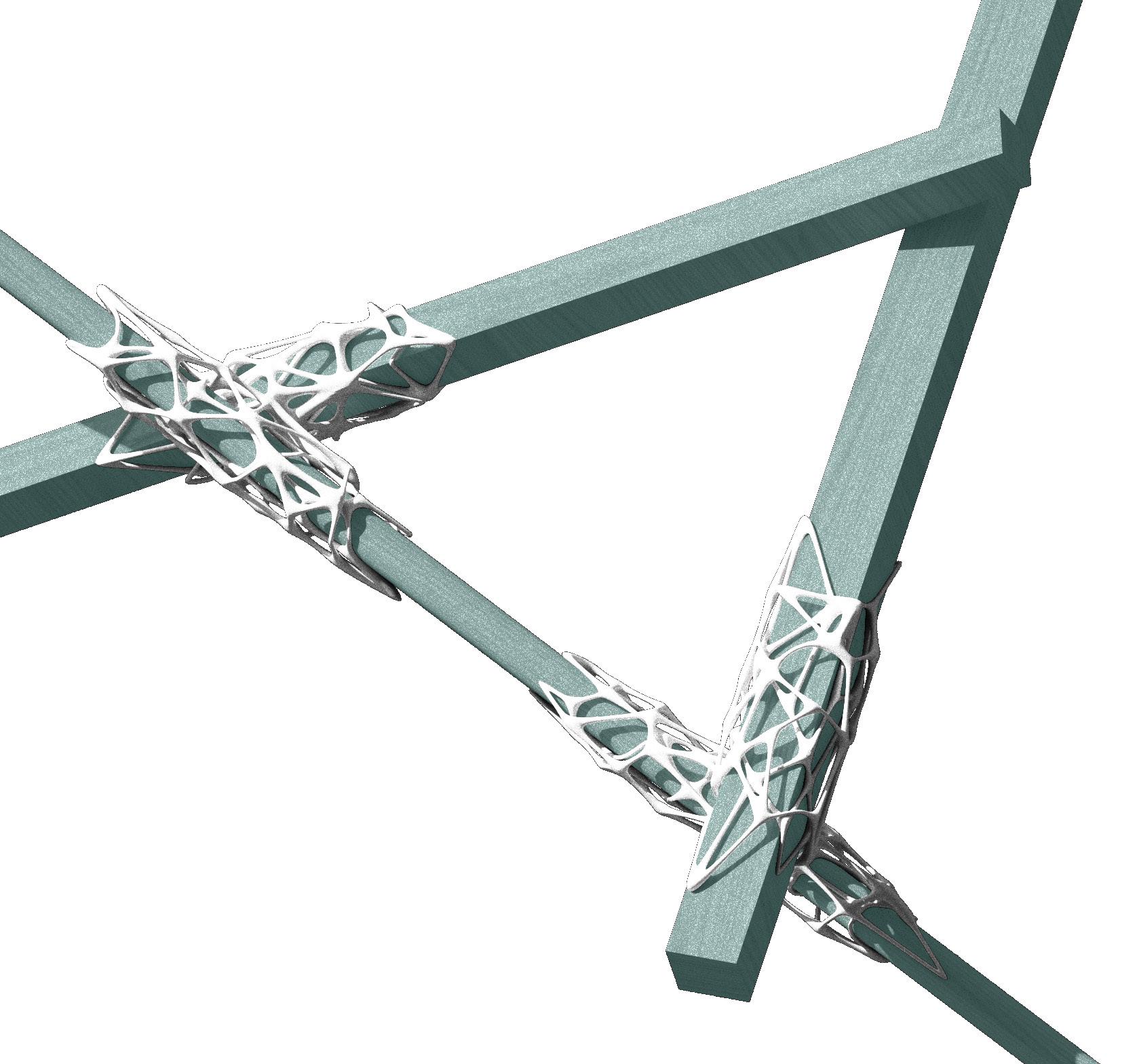 Die Formfindung orientiert sich an biomimetischen Strukturen und wurde mithilfe algorithmischer Entwurfsmethoden in Grasshopper optimiert. Die Kombination von präziser digitaler Planung und handwerklicher Umsetzung resultierte in der Entwicklung eines konstruktiven Systems, das sowohl ästhetisch als auch funktional überzeugt. Es handelt sich um einen Knotenpunkt zwischen Naturprinzipien und innovativer Bautechnologie.