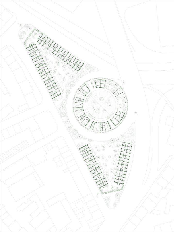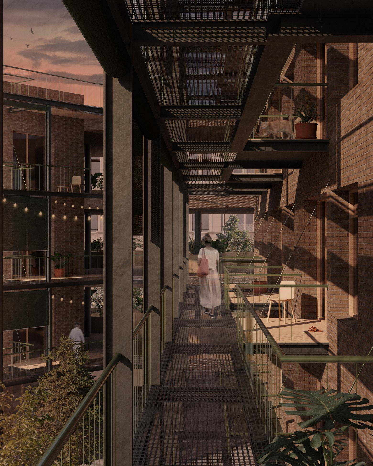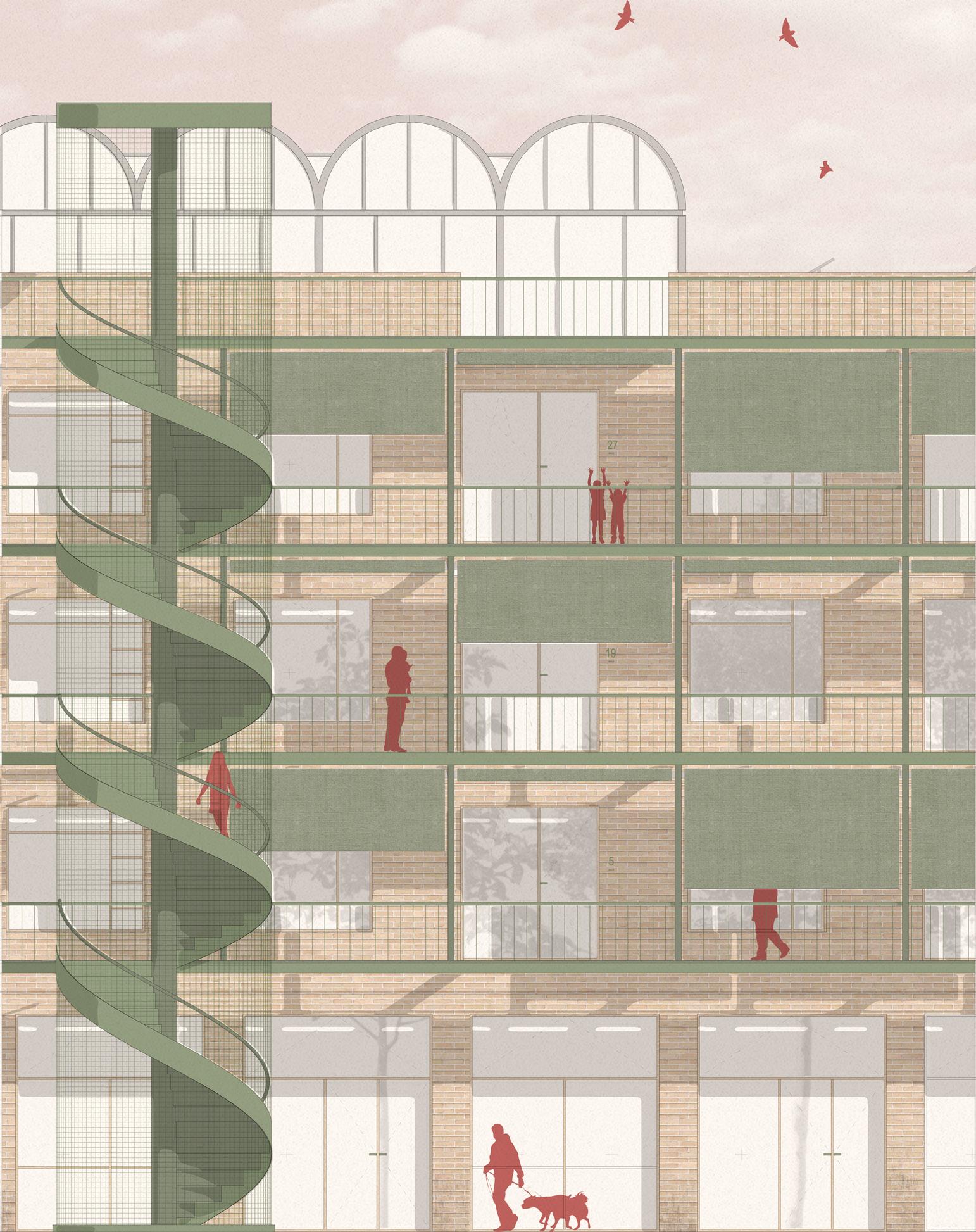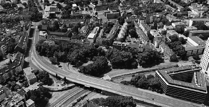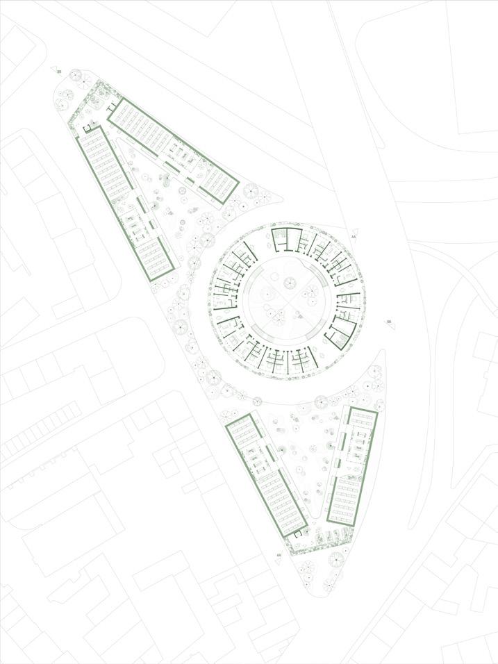 Das Wohnungsbauprojekt an der Tel-Aviv-Straße in Köln reagiert auf die besondere städtebauliche Lage an stark befahrenen Hauptstraßen mit hohen Lärm- und Emissionseinträgen. Ziel ist es, ein Wohnquartier zu entwickeln, das trotz dieser Belastungen eine hohe Aufenthalts- und Lebensqualität bietet. Kleine, intensiv begrünte Innenhöfe fungieren als geschützte Rückzugsräume, die sowohl atmosphärisch aufwerten als auch funktional die Luftqualität verbessern und Emissionen abmildern. Die nachhaltige Nutzung von Dachflächen durch Photovoltaikanlagen und gemeinschaftlich nutzbare Gärten stärkt die ökologische Qualität und fördert soziale Vernetzung.