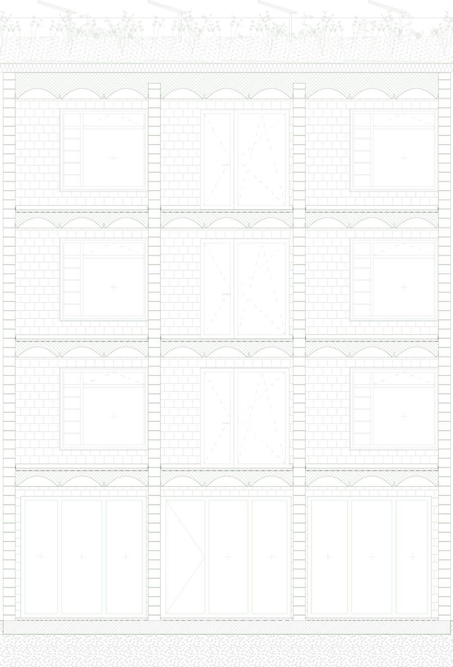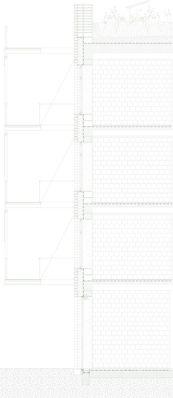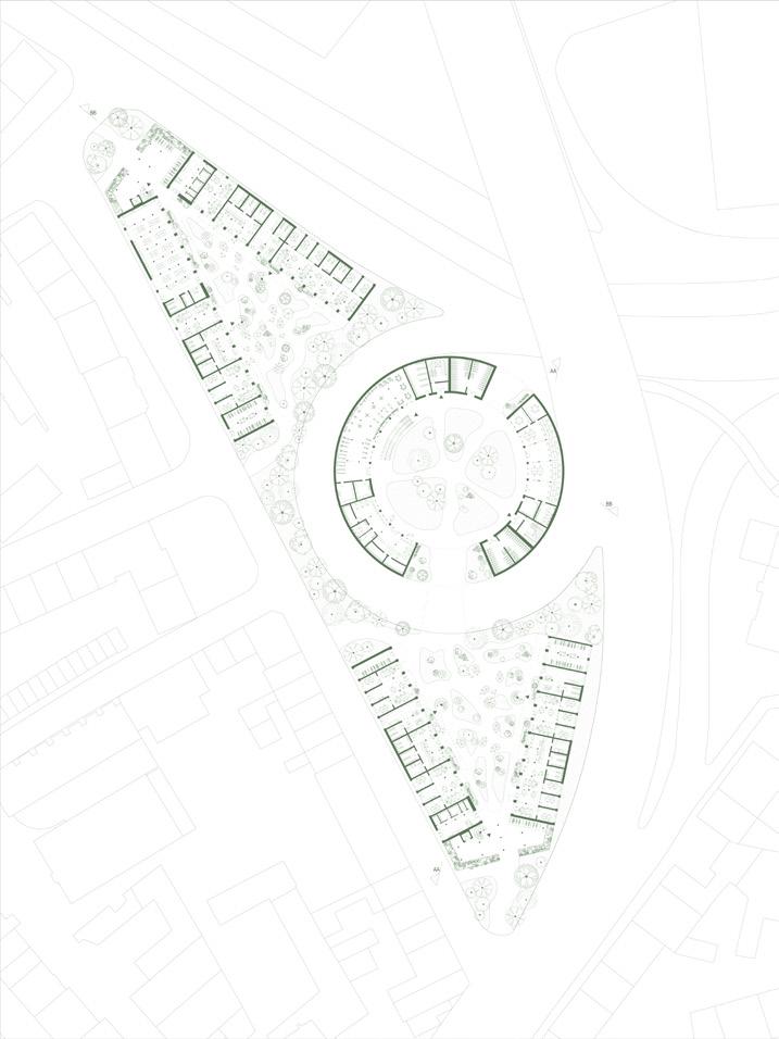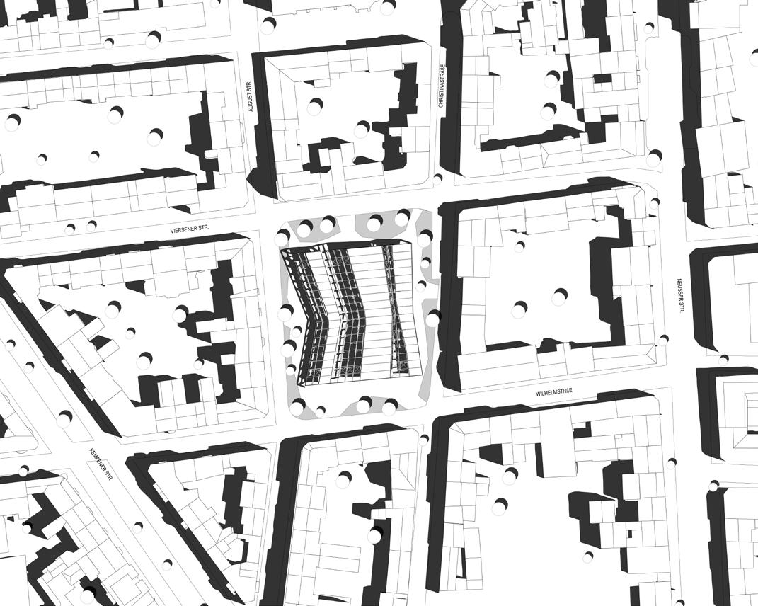 Das Wohnungsbauprojekt an der Tel-Aviv-Straße in Köln reagiert auf die besondere städtebauliche Lage an stark befahrenen Hauptstraßen mit hohen Lärm- und Emissionseinträgen. Ziel ist es, ein Wohnquartier zu entwickeln, das trotz dieser Belastungen eine hohe Aufenthalts- und Lebensqualität bietet. Kleine, intensiv begrünte Innenhöfe fungieren als geschützte Rückzugsräume, die sowohl atmosphärisch aufwerten als auch funktional die Luftqualität verbessern und Emissionen abmildern. Die nachhaltige Nutzung von Dachflächen durch Photovoltaikanlagen und gemeinschaftlich nutzbare Gärten stärkt die ökologische Qualität und fördert soziale Vernetzung.