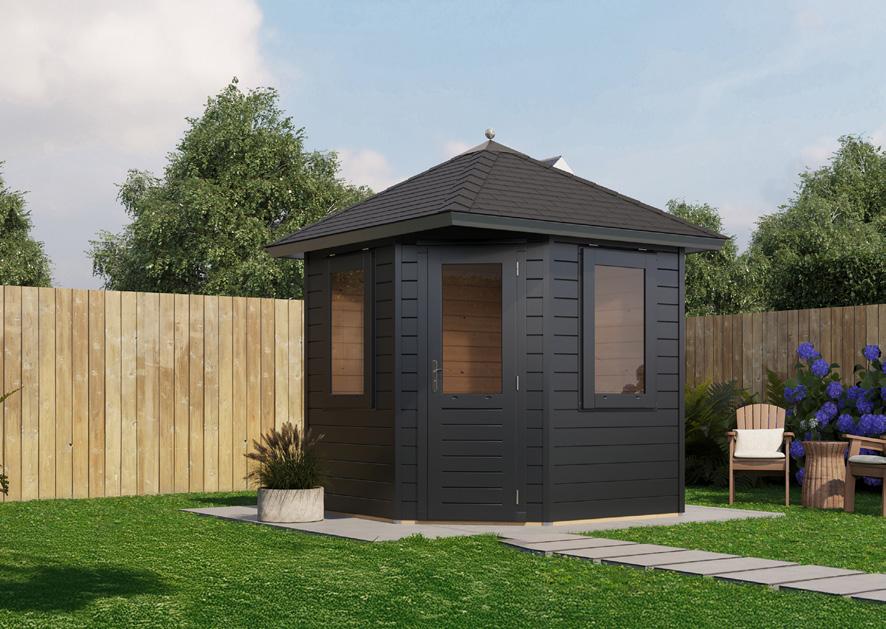 Die Prima-Kollektion verbindet elegantes Design mit intelligenter Technik. Dank des patentierten 3-in-1-Eckverbindungssystems sind keine sichtbaren Schrauben oder Verbindungselemente vorhanden, was für ein klares und hochwertiges Erscheinungsbild sorgt. Erhältlich in rechteckigen und achteckigen Ausführungen mit Flach-, Satteloder Pyramidendach. Ideal für alle, die ein einzigartiges Gartenhaus suchen, das sich als Stauraum, Hobbyraum oder Arbeitsplatz eignet.