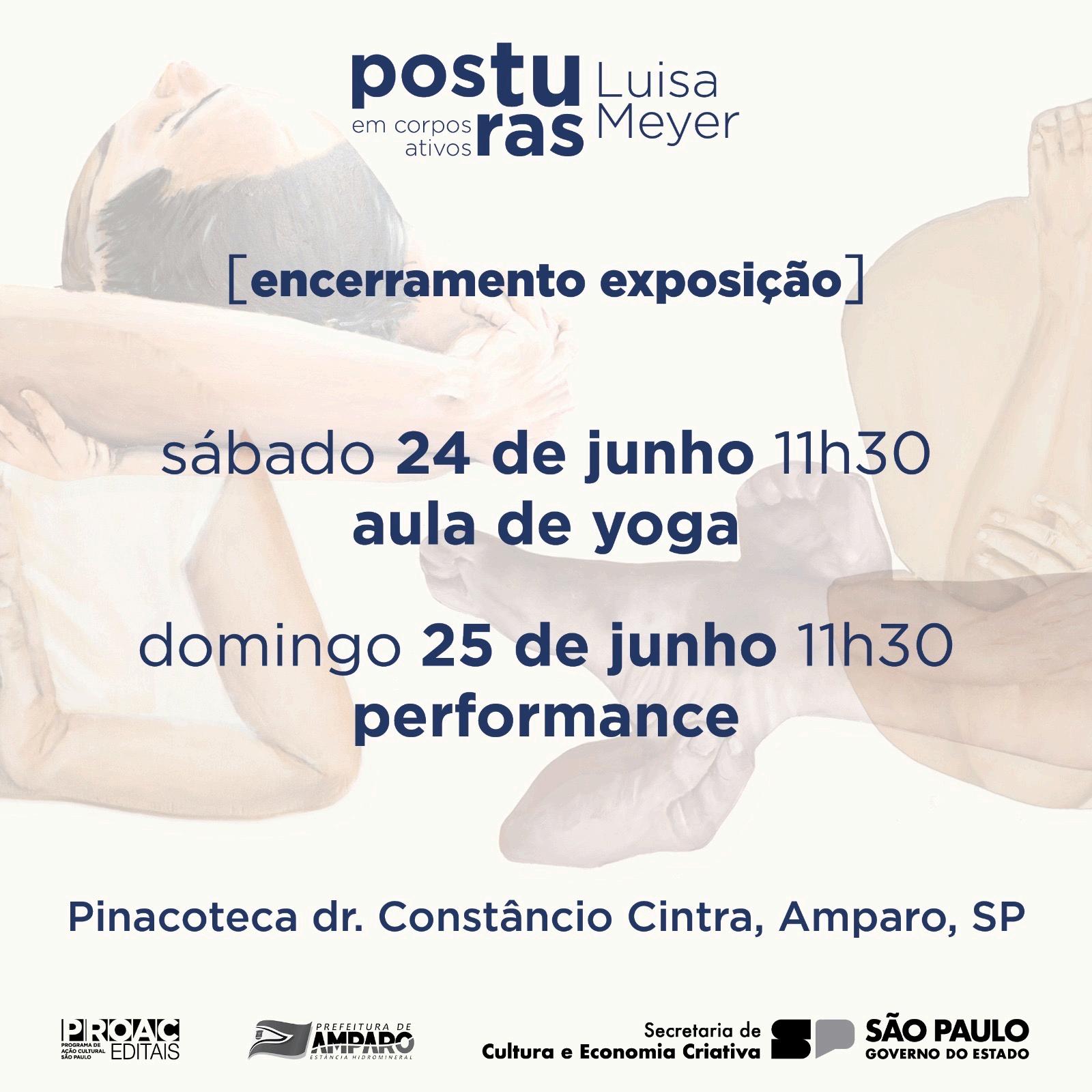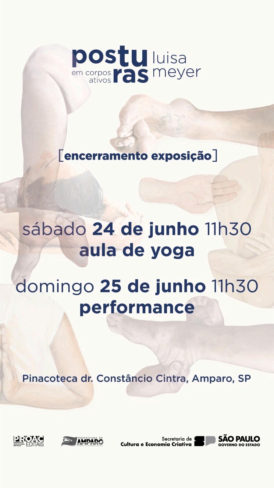 *a atividade performance da exposição Posturas em Corpos Ativos da artista visual Luisa Meyer foi realizada Pinacoteca Municipal Dr. Constancio Cintra, na cidade de Amparo nos dias 25 de junho, sob a coordenação de Luísa Meyer e a participação de diversos artistas e praticantes de yoga.