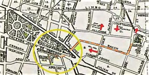 Al Parque Hidalgo le llegó el Eje López Mateos por el Surylopar óendosconungiroalNorte.Eraelañode 1963 y habían empezado las demoliciones de las fincas por la calle MORELOS, el giro al norte lo dio el Eje en la calle AZUCENA haciéndola desaparecer,