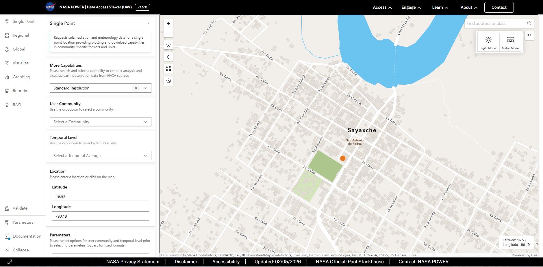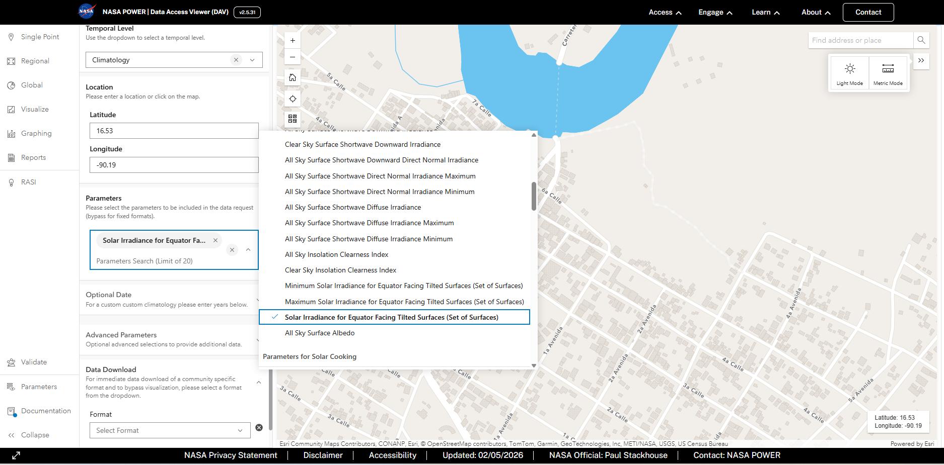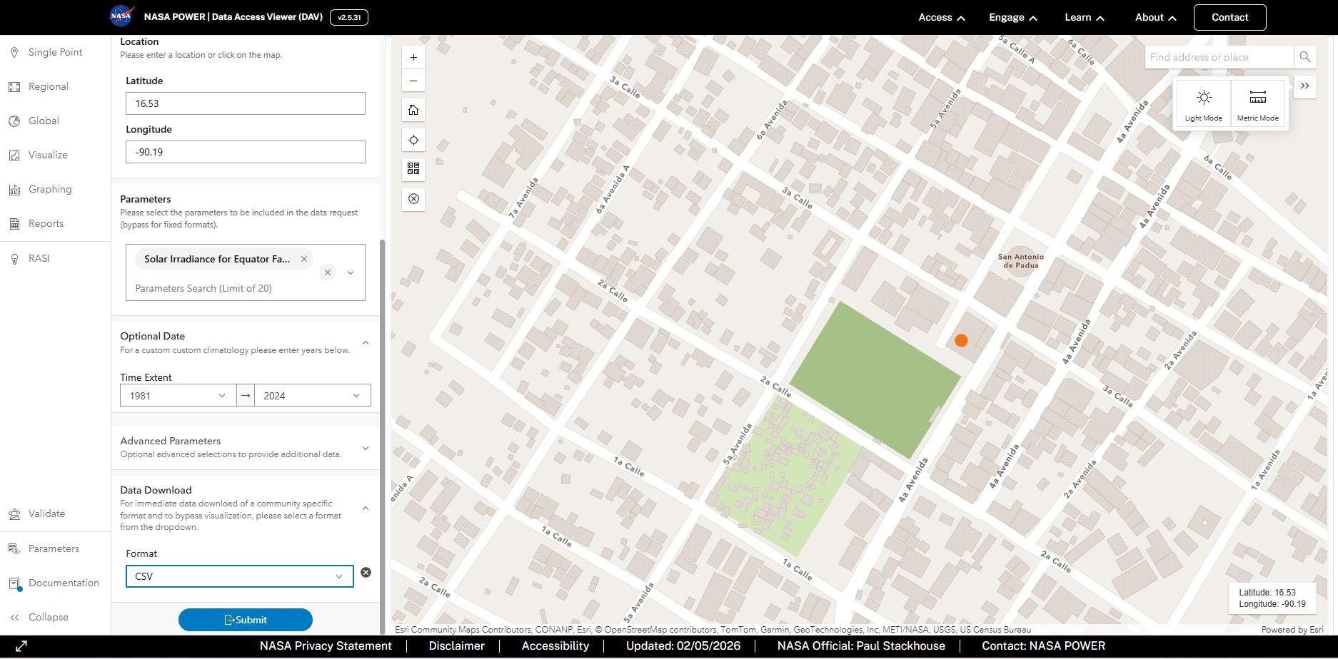 Paso 1: Conectarse a la base de datos de meteorología de superficie y energía solar de la NASA para una ubicación en particular, aquí: https://power.larc.nasa.gov/data-access-viewer/