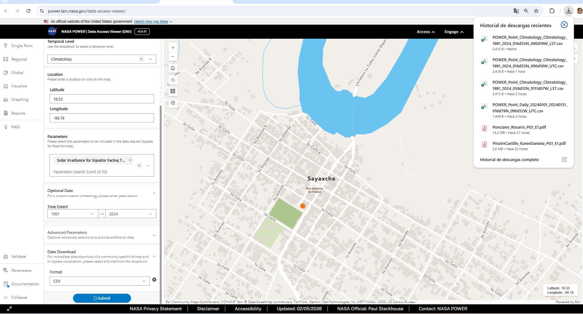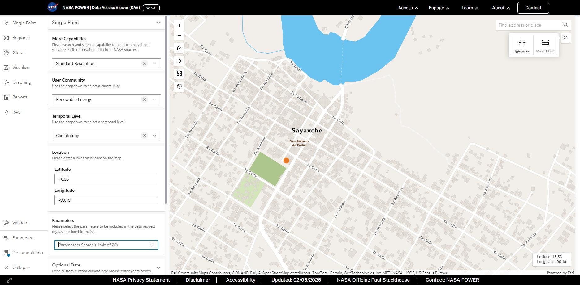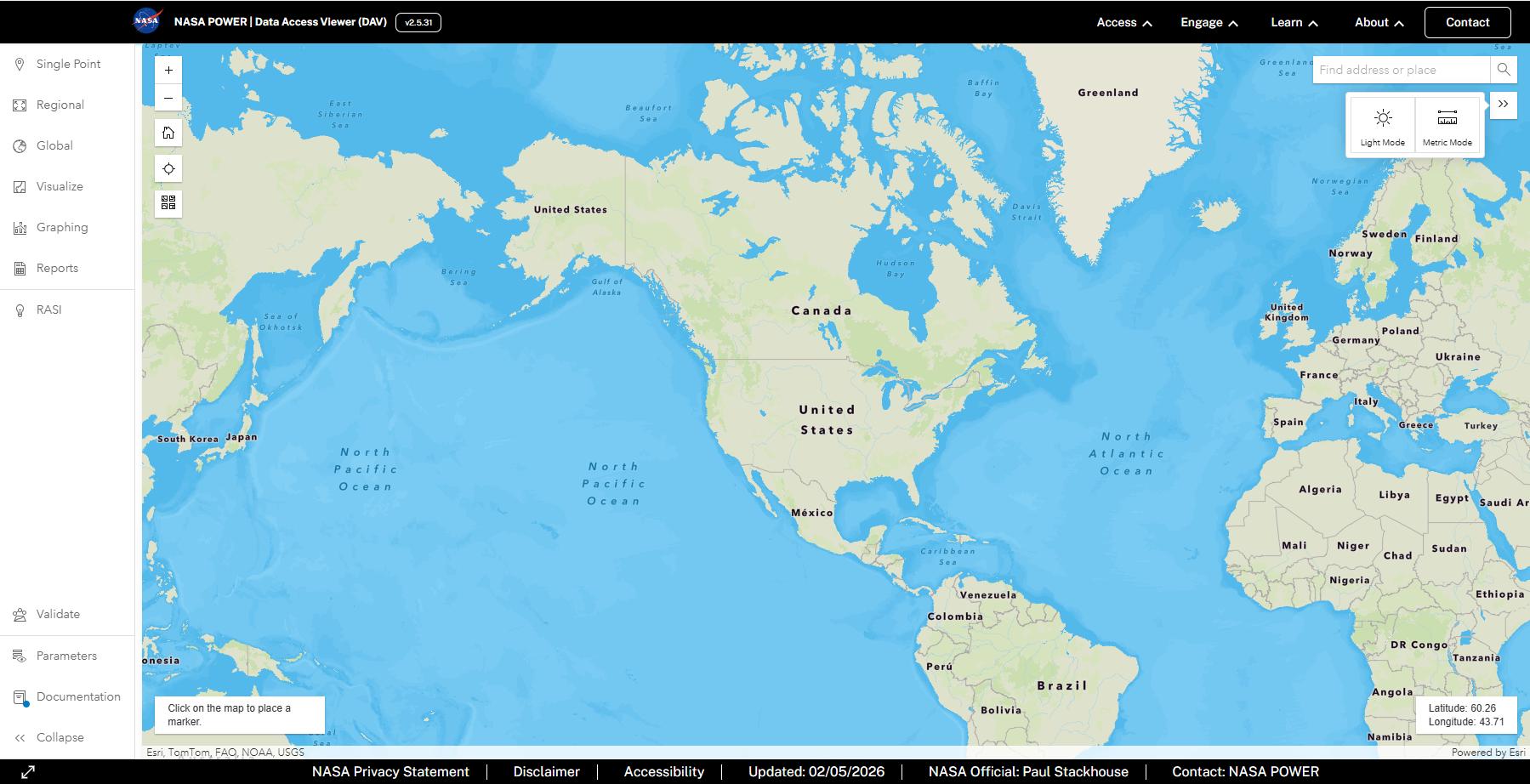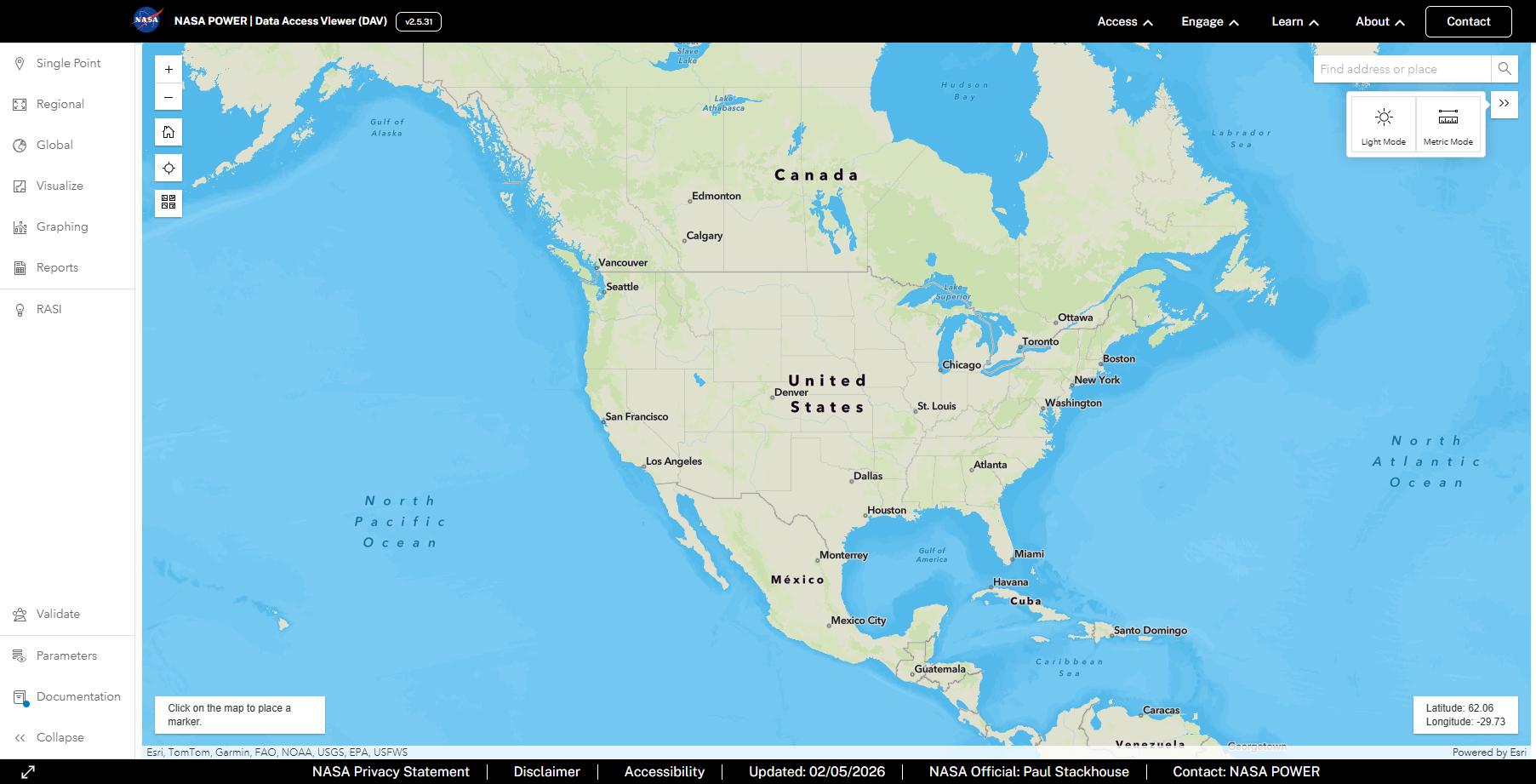 Paso 1: Conectarse a la base de datos de meteorología de superficie y energía solar de la NASA para una ubicación en particular, aquí: https://power.larc.nasa.gov/data-access-viewer/