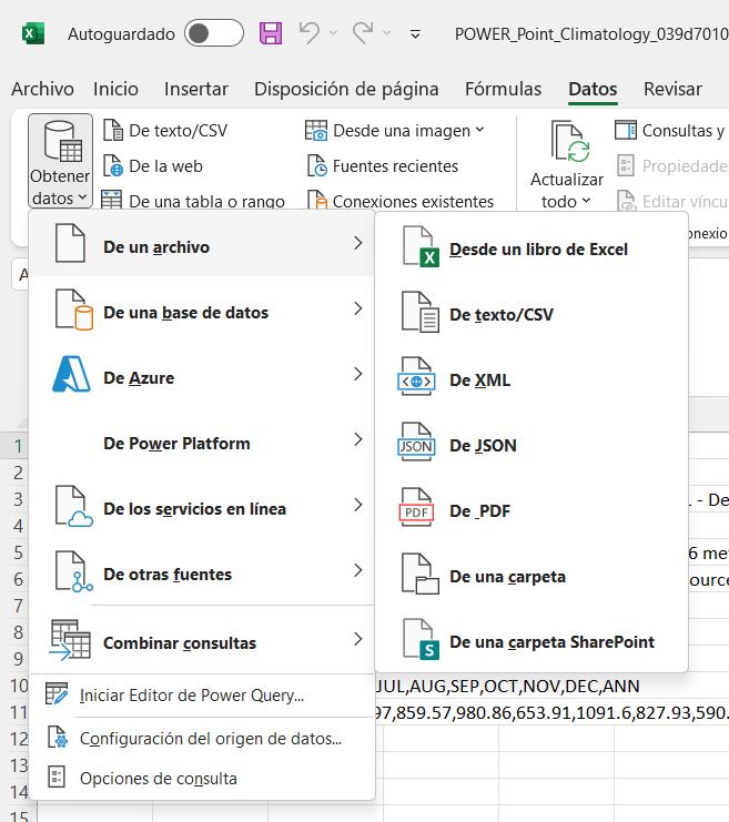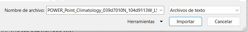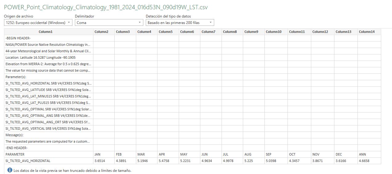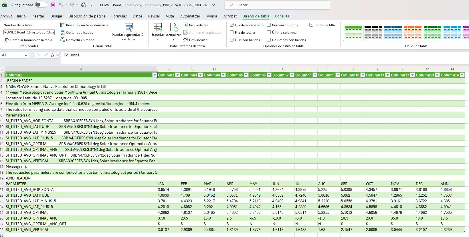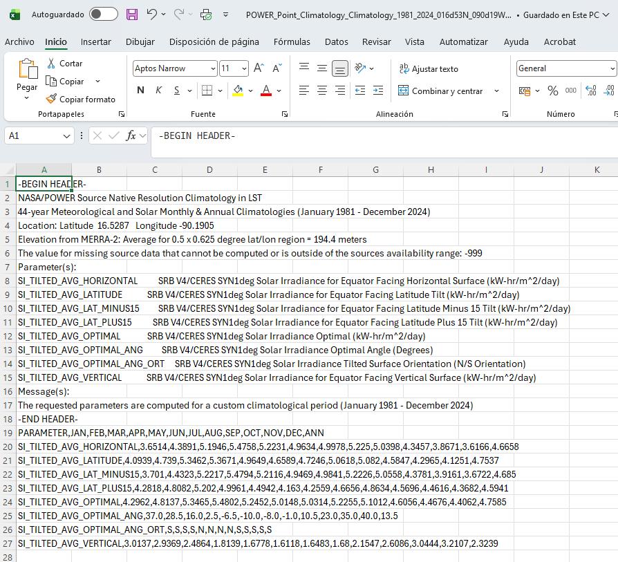 En el siguiente archivo ejemplo xlsx, se obtienen los valores de irradiancia promedio mensual y anual para los siguientes parámetros en kW-hr/m2/día: