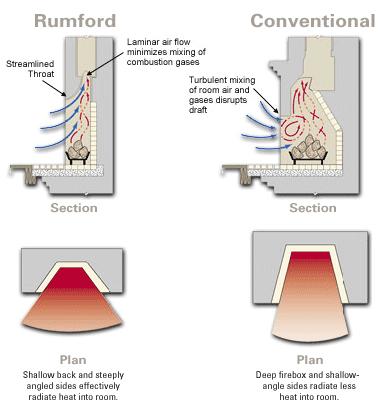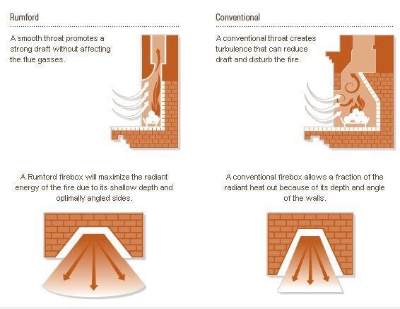 Una cámara de combustión Rumford maximizará la energía radiante del fuego debido a su poca profundidad y lados en ángulo óptimo
