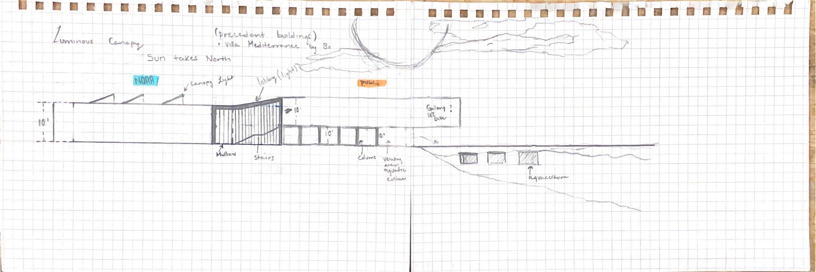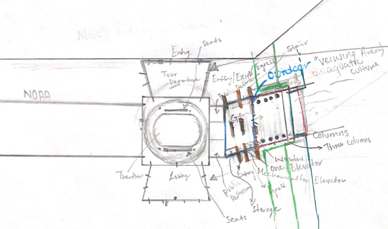 Located along the Galveston Seawall at the north-eastern end of the island, the NOAA Reachsearch Vessel, a mixed innovation center where the public and NOAA scientists dedicate to study the ocean, climate, and space. Based on National Oceanic and Atmospheric Administration (NOAA) mission statement, the design concept of the project is intended to reach out towards research staff and the public about the study of the ocean , marine life species harvesting, and hurricane preparedness. Therefore, the final form design resembles the soon-to-be developed IKE Dike, a barrier system located between the northeast end of Galveston