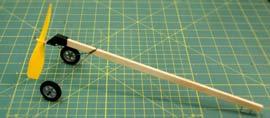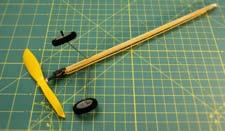 Belkę kadłubową można już w y posaż yć w podwozie. Prostokątne ucho na ramce z drutu wchodzi ciasno w podcięcia. Połączenie dodatkowo wzmocnione jest klejem. Po wciśnięciu z przodu obsady śmigła można zająć się budową silnika. A właściwie nie silnika, t ylko akumulatora jego energ ii, czyli pasm gumy modelarsk iej. Teoretycznie do napędu modelu nadają się nawet g umki recepturki, jednak stosowana w modelarstw ie guma kauczukowa ma w iększą trwałość i lepsze własności uż y tkowe. Do pierwsz ych lotów w ystarczy pakiet złożony z czterech gum o kwadratowym przekroju 1 mm x 1 mm. Długość pasm trzeba dobrać tak, aby, wisząc swobodnie, były one dłuższe o około 1 cm od odległości pomiędzy tylnym zaczepem a uchem na wale śmigła. Po oblataniu modelu można pogrubić pakiet, dodając dwa lub więcej pasm do wiązki. W ten sposób zwiększ y się moc gumowego silnika, czyli w efekcie szybkość lotu modelu.