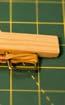 Teraz jeszcze konieczne jest w w ykonanie podpórki zapewniającej odpow iedni kąt zaklinowania skrzydła, czyli uniesienia jego krawędzi natarcia o 3–5 stopni w stosunku do osi belki. Podpórka w ykonana jest z tego samego materiału, co belka kadłubowa, czyli z listw y sosnowej. Prz ycięto ją ukośnie wzdłuż i prz yklejono do kadłuba 3 cm za wspornikiem śmigła. Podcięcie dodatkowo unieruchamia ramkę podwozia.