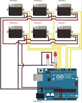 – jednym przewodem połącz czerwone przewody z pinem zasilania 5 V na płytce Arduino, –wszystkie przewody czarne połącz z pinem GND jak wyżej, – przewody sterujące (żółte), wychodzące z serwomechanizmów, przyłącz bezpośrednio do pinów wysyłających sygnały PWM na płytce Arduino (piny oznaczone „~”, tj. 3., 5., 6., 9., 10. i 11.), – przewody od anod diod świecących połącz poprzez rezystor z pinami 12. i 13., natomiast katodę połącz z pinem GND,