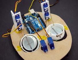 – pamiętaj, by połączyć serwomechanizmy z gałkami ocznymi (piłeczki) i powiekami (pierścienie); zrób to popychaczem uformowanym z miedzianego drucika, – piłeczkę pingpongową połącz z górnym serwomechanizmem, umieszczonym na platformie, –plastikową obręcz połącz z dolnym serwomechanizmem.