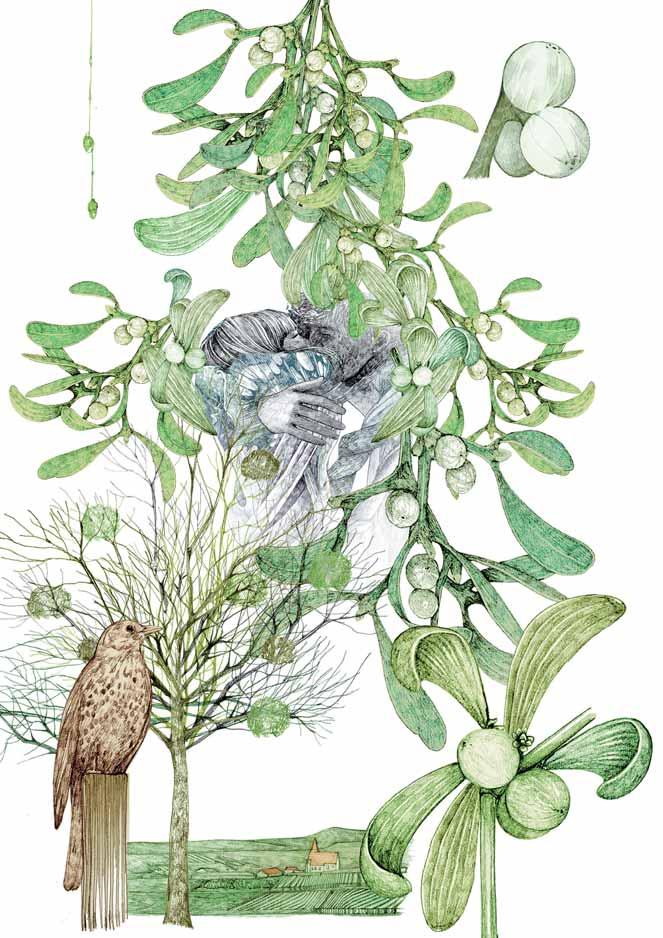 Gdy nasiona jemioły znajdą się już na gałęzi, roślina ujawnia swoje mroczne oblicze. Kiełkują z nich smukłe przyssawki, które wczepiają się w żywą tkankę drzewa. Dzięki temu przez resztę swojego życia jemioła (podobnie jak jej kwiecista kuzynka Nujcja, patrz s. 129) egzystuje w roli półpasożyta. Co prawda, gatunek wykorzystuje swoje liście do przeprowadzania fotosyntezy, jednak całą pulę potrzebnej wody i dodatkowych substancji odżywczych pozyskuje od gospodarza, który przez to w rezultacie rośnie wolniej i jest bardziej podatny na choroby. Ze względu na to, że działalność jemioły redukuje ilość pozyskiwanego drewna i owoców z drzew w naprawdę znaczącym stopniu, we Francji wdrażane są regionalne regulacje narzucające właścicielom posesji oraz działek usuwanie jemioły. Na szczęście, ma ona już przygotowane miejsce na rynku.