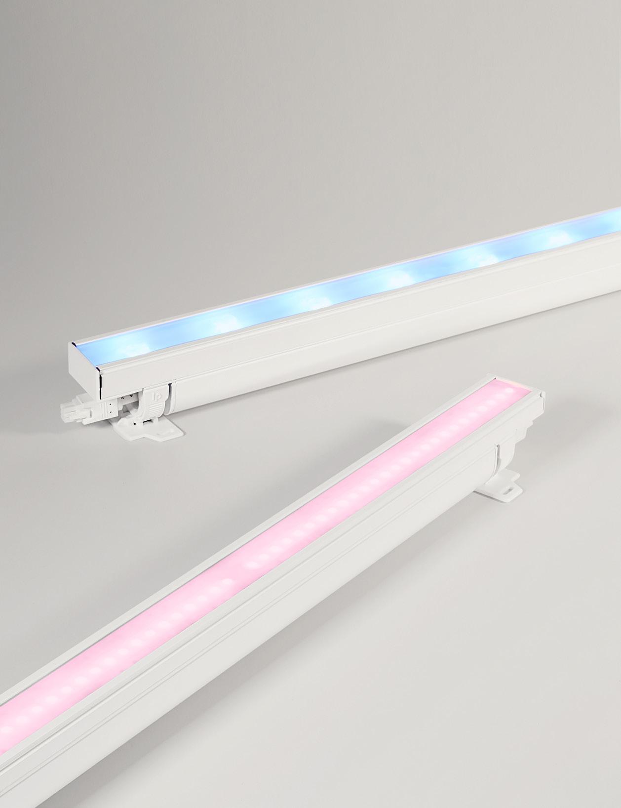 Les luminaires Lumencore Linear Cove et Graze Color Changing, alimentés par Optidrive™, offrent des couleurs riches et saturées ainsi qu'une lumière blanche de haute qualité avec une précision et un mélange homogène. Cette solution 2 en 1 permet aux concepteurs d'utiliser un éclairage blanc fonctionnel le jour et des couleurs expressives la nuit. Ceci est idéal pour mettre en valeur l'architecture, l'identité de marque et l'impact visuel.