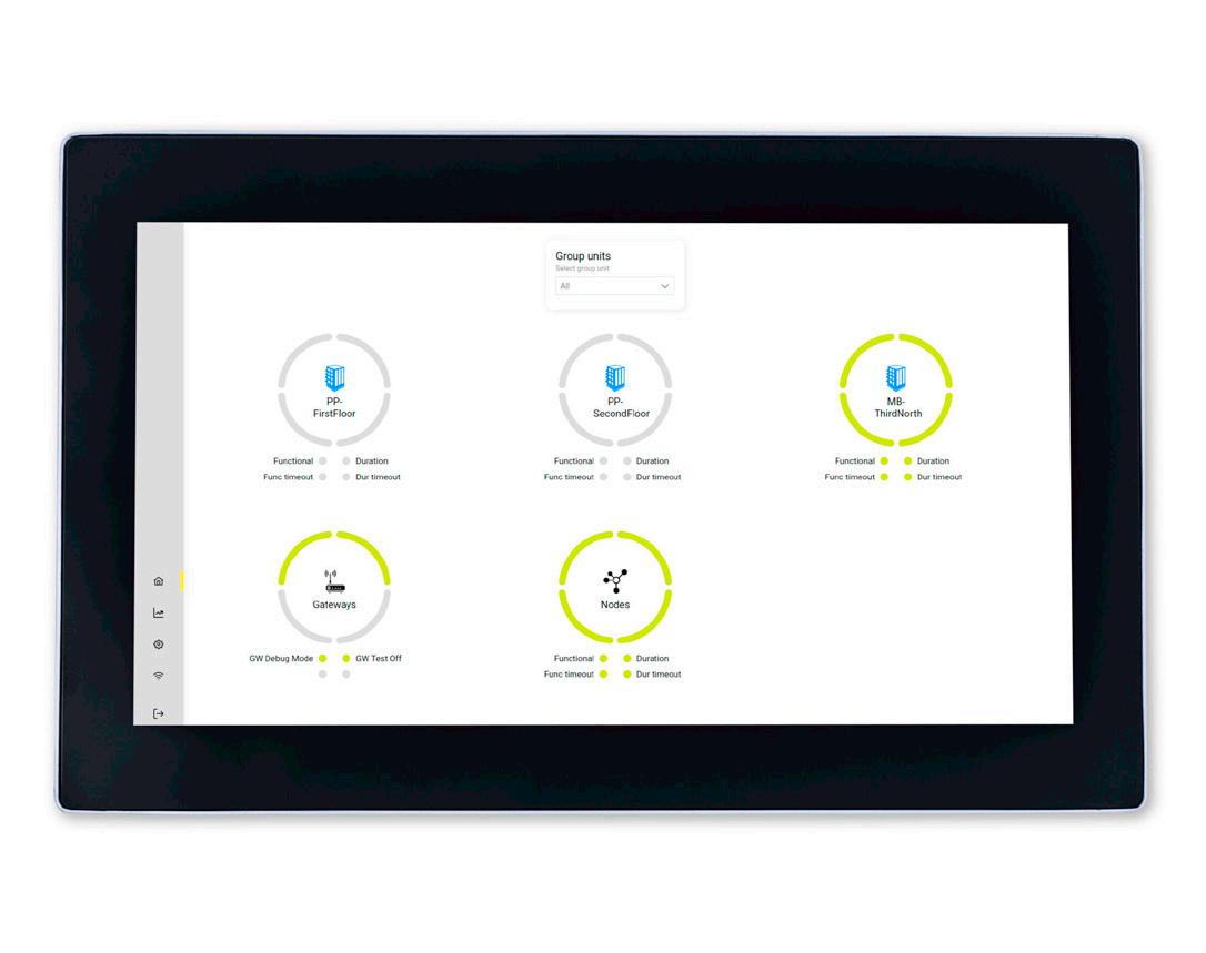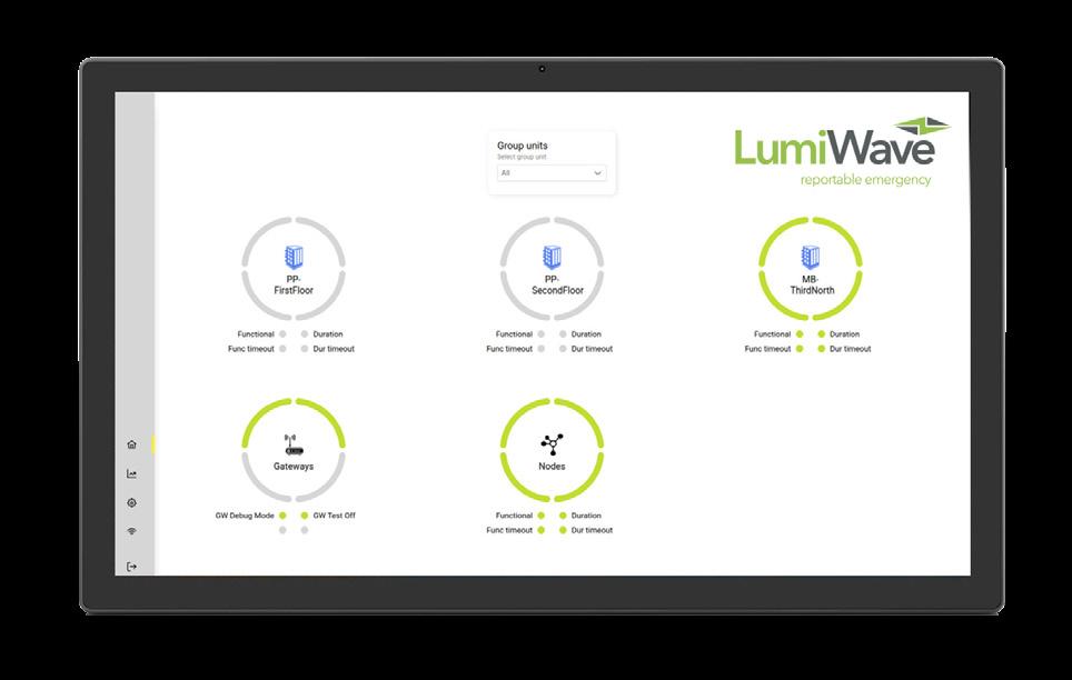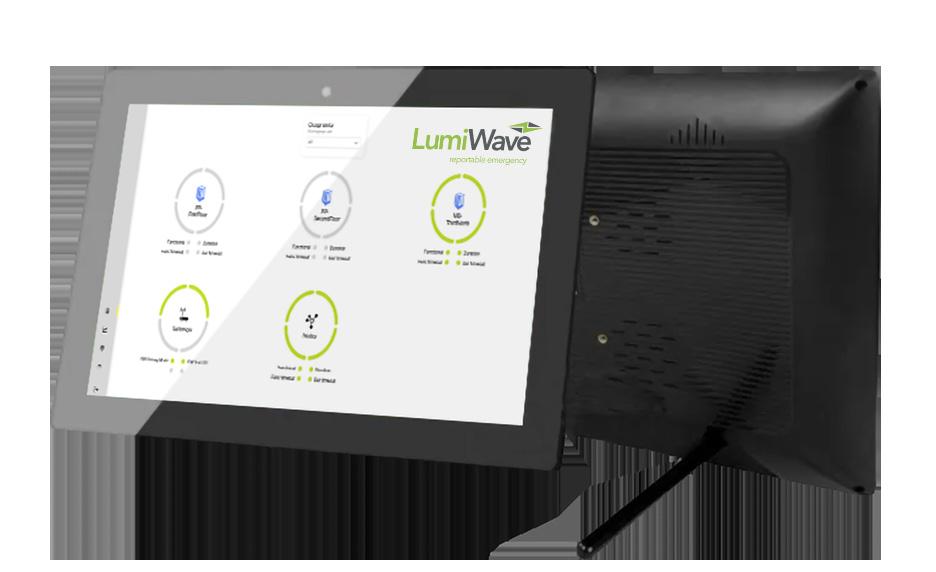 The LumiWave touchscreen provides a simple and intuitive local interface for monitoring and managing the emergency lighting system on site.