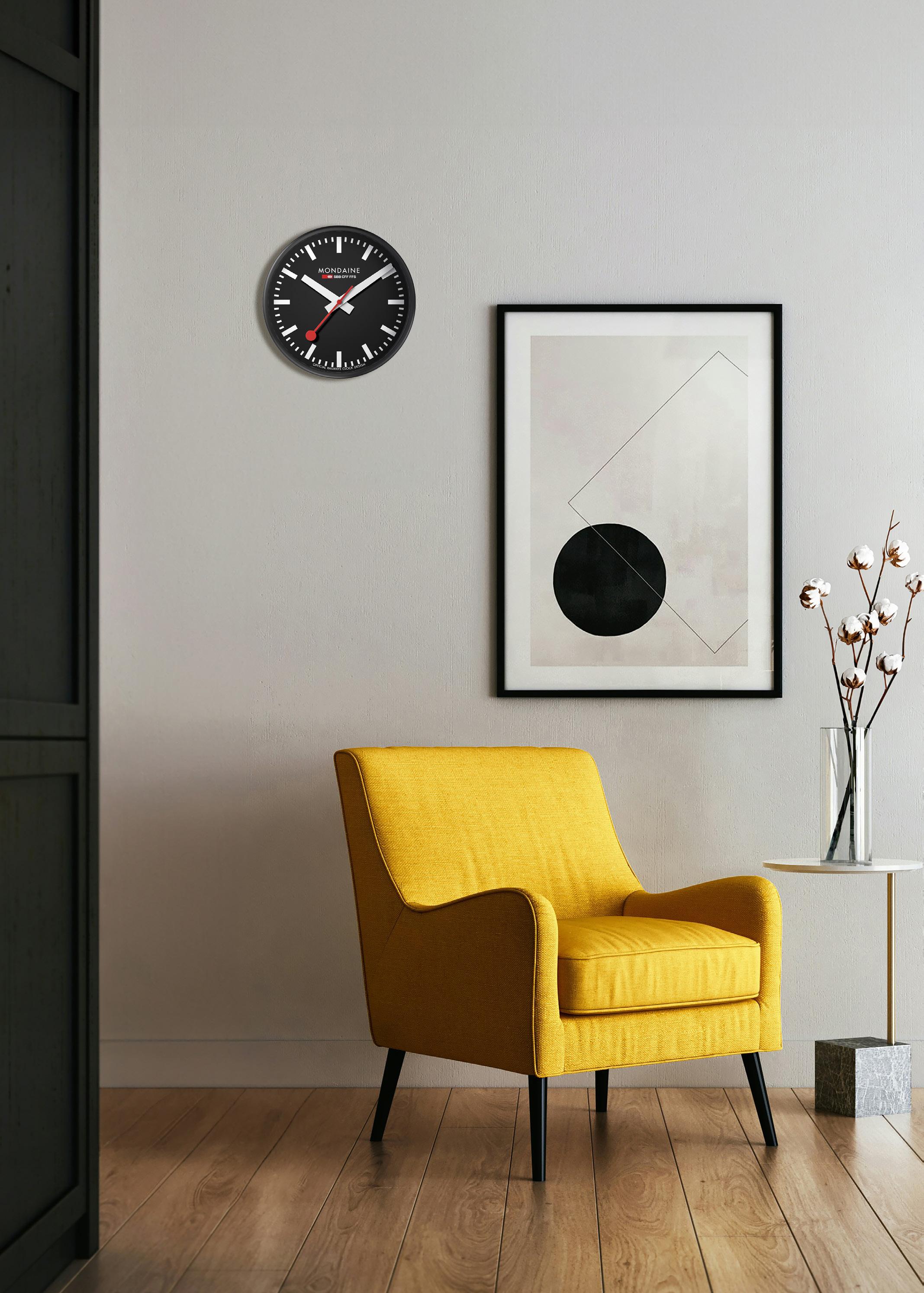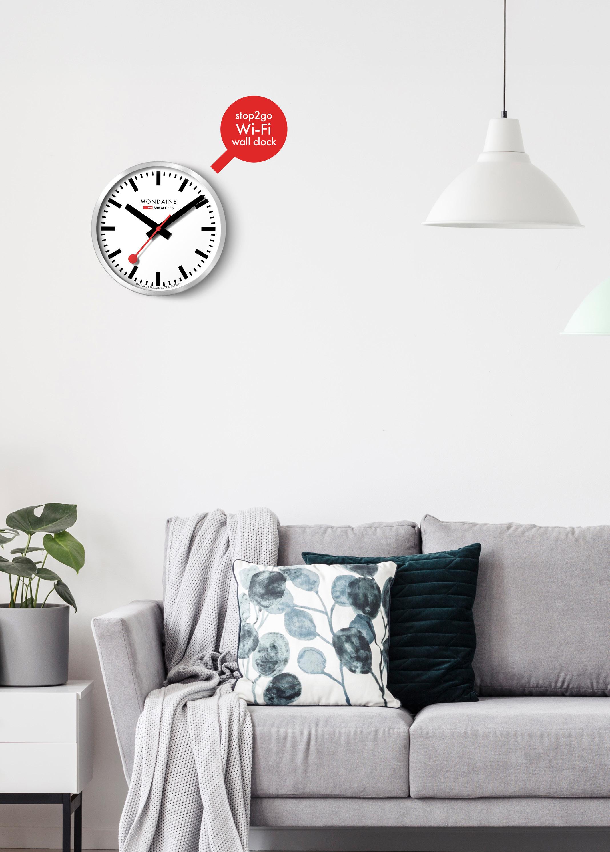 The stop2go Wi-Fi wall clock replicates the iconic Swiss Railways Station Clock and can be set via smartphone with Wi-Fi connectivity. 2022