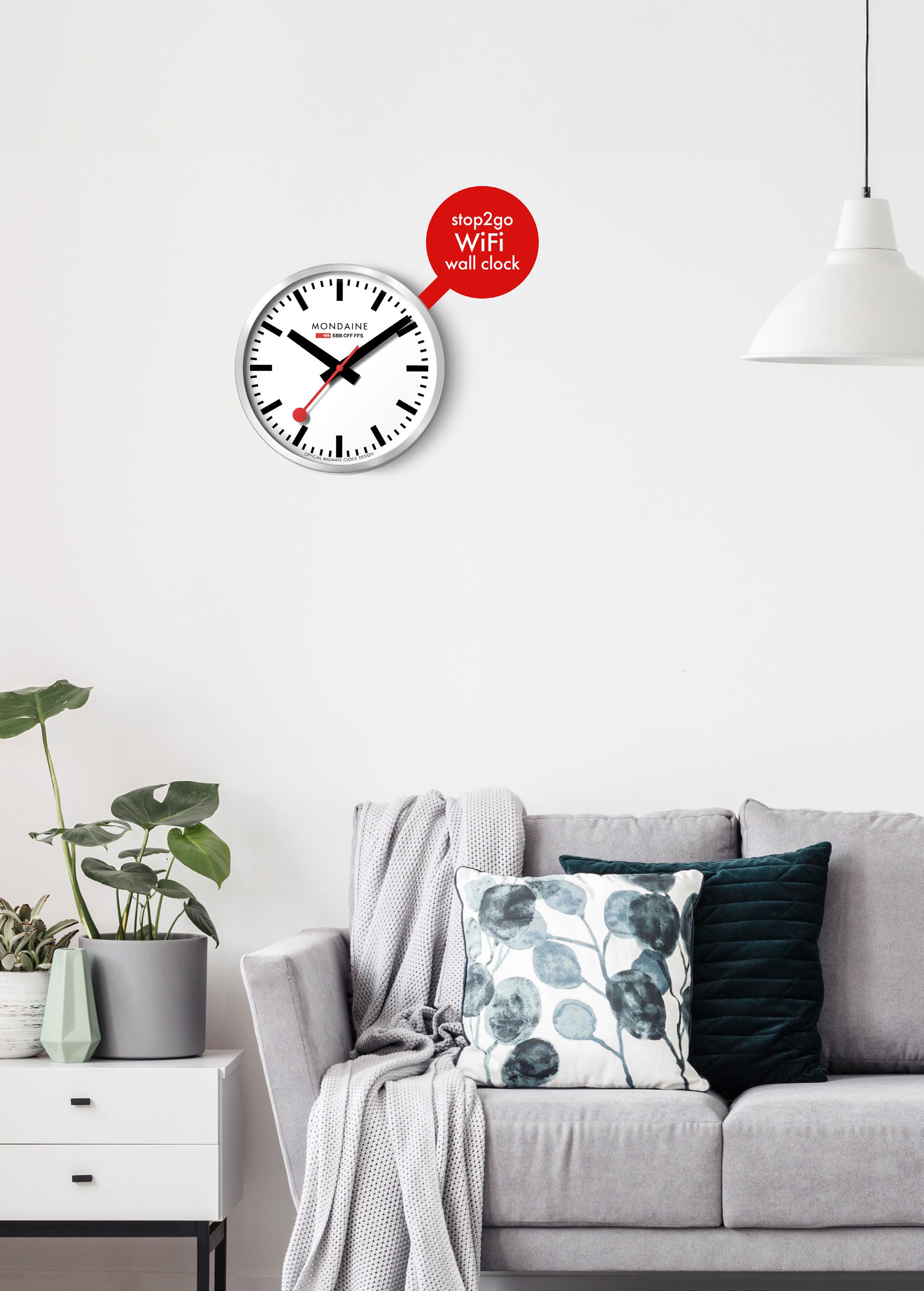 Clock to synchronize and align with all railway clocks across the country every minute. This meticulous synchronization process not only ensured perfect accuracy of the Swiss railways timetable but also contributed to the renowned reputation of the Swiss for their unrivalled punctuality. Our stop2go collection pays tribute to this heritage showcasing a clever movement that lets time stand still just like the railway station clock. Iconic industrial design with WiFi connection. The MONDAINE stop2go WiFi wall clock offers an easier user experience thanks to a one-time setup via WiFi.