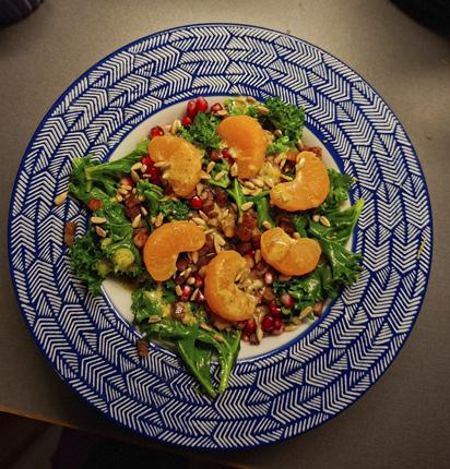 6. I en djup tallrik, lägg grönkålen i botten och toppa därefter med solrosfrön, granatäpple och vegobacon. Avsluta med att lägga på mandarinerna och ringla över dressingen precis innan servering.