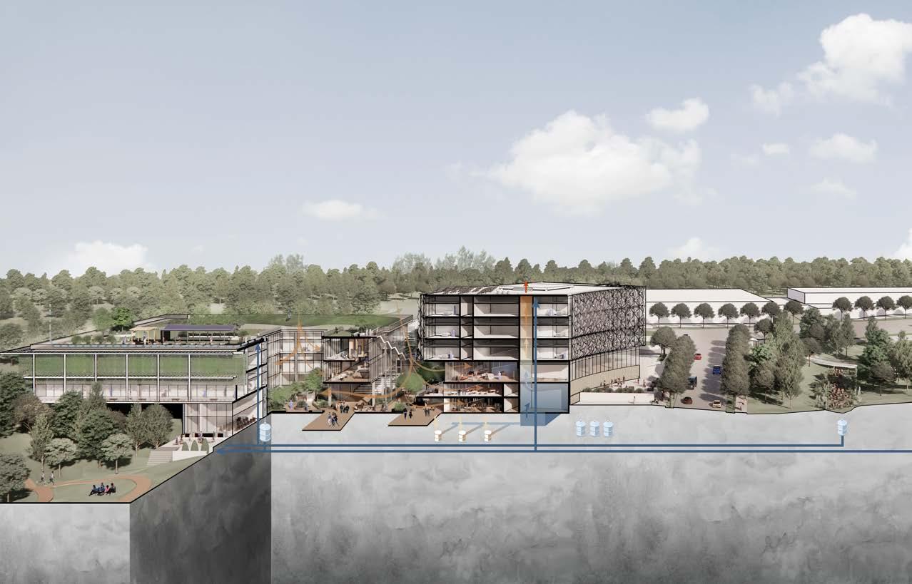 LIVING ROOF AREA PRE-FILTRATION FOR RAINWATER THERMAL CHIMNEY GROUND CONTACT EARTH TUBES MECHANICAL CISTERNS FOR COLLECTION CHILLER +FILTER SOLAR HOT WATER PANELS DAYLIGHT + FRESH AIR 77°F 31°F SUMMER SOLSTICE WINTER SOLSTICE