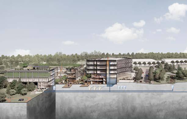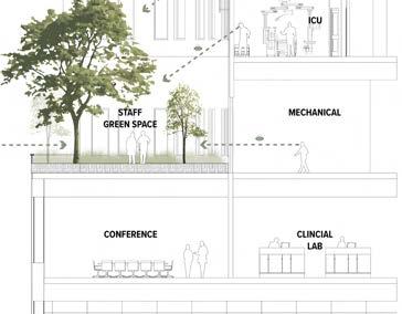 The hospital design integrates highefficiency HVAC systems and passive design strategies like daylighting and solar shading to achieve a 25% reduction in energy use compared to conventional hospitals. Continuous performance monitoring will ensure that these energy-saving measures, alongside the use of renewable energy and highefficiency systems, meet sustainability and operational goals throughout the building’s life.